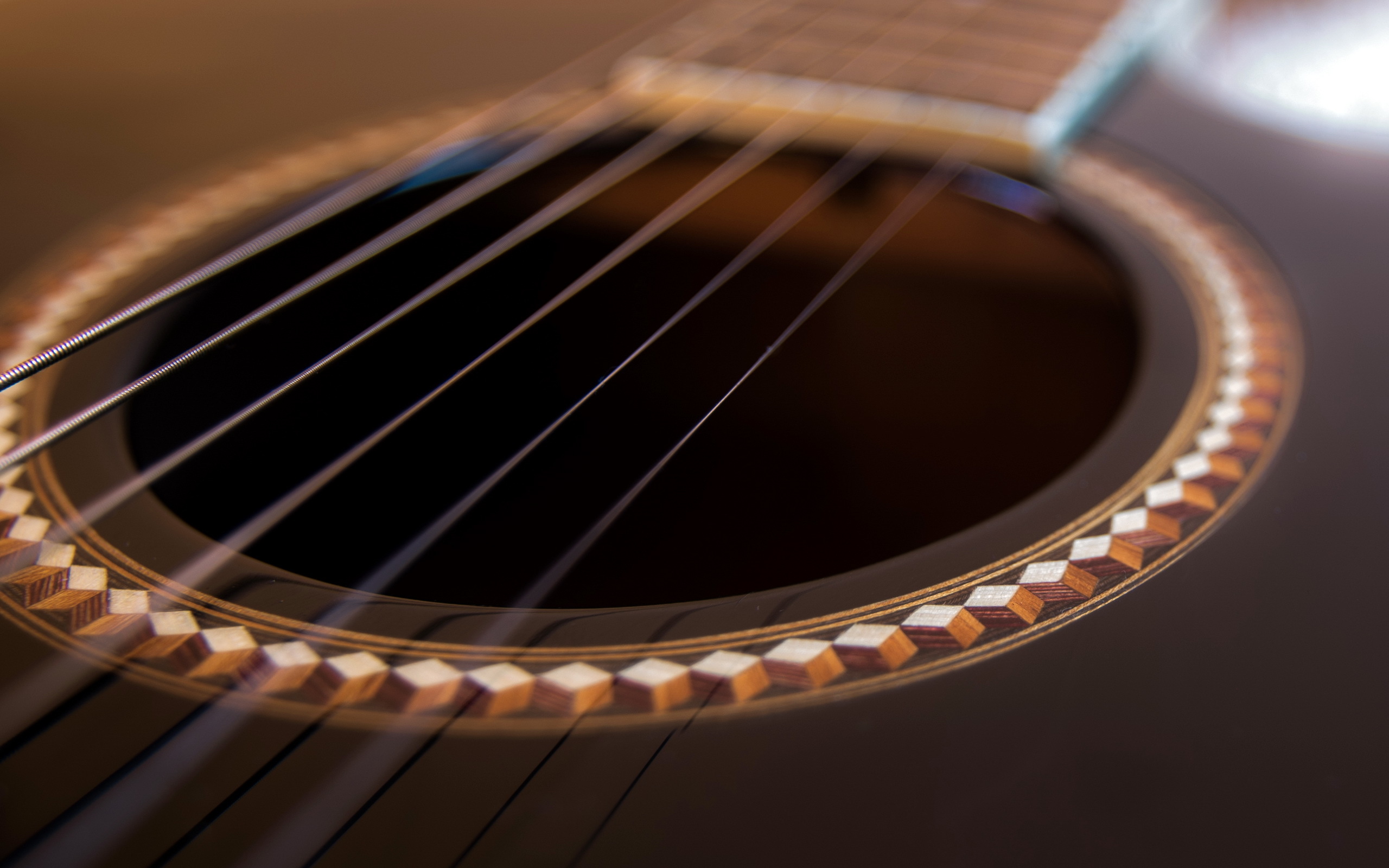Description: A close up of a guitar strings and strings on a guitar body with a blurry background of a guitar.