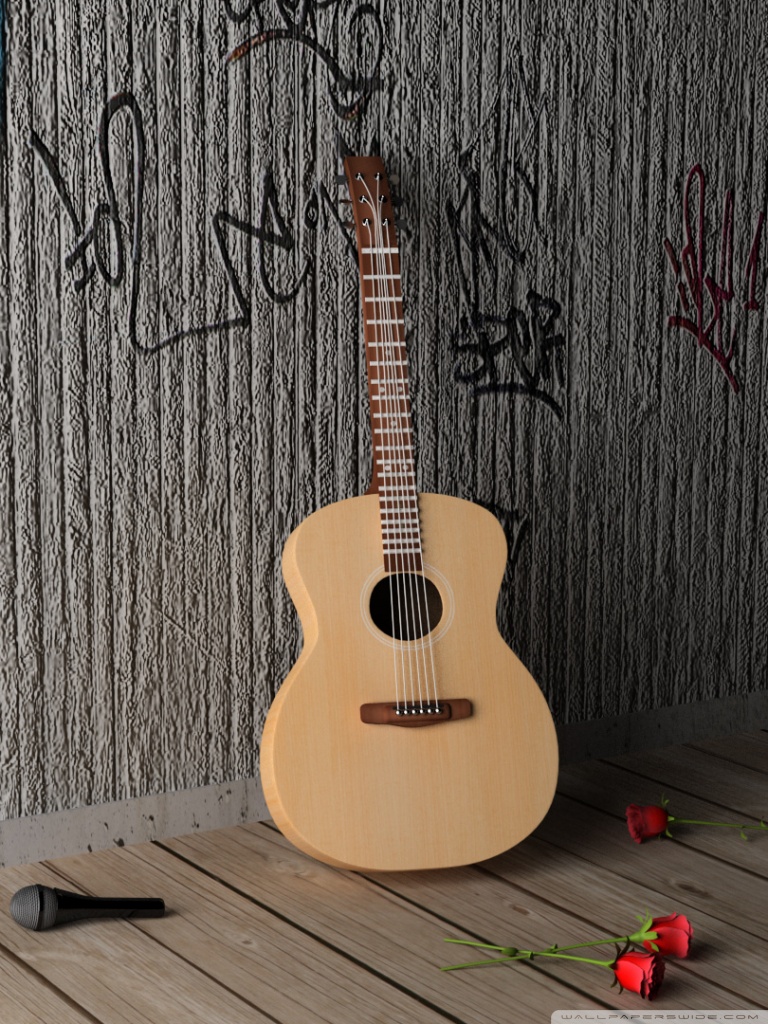 Description: A guitar sitting on a wooden floor next to a wall with graffiti on it and a mouse on the floor.