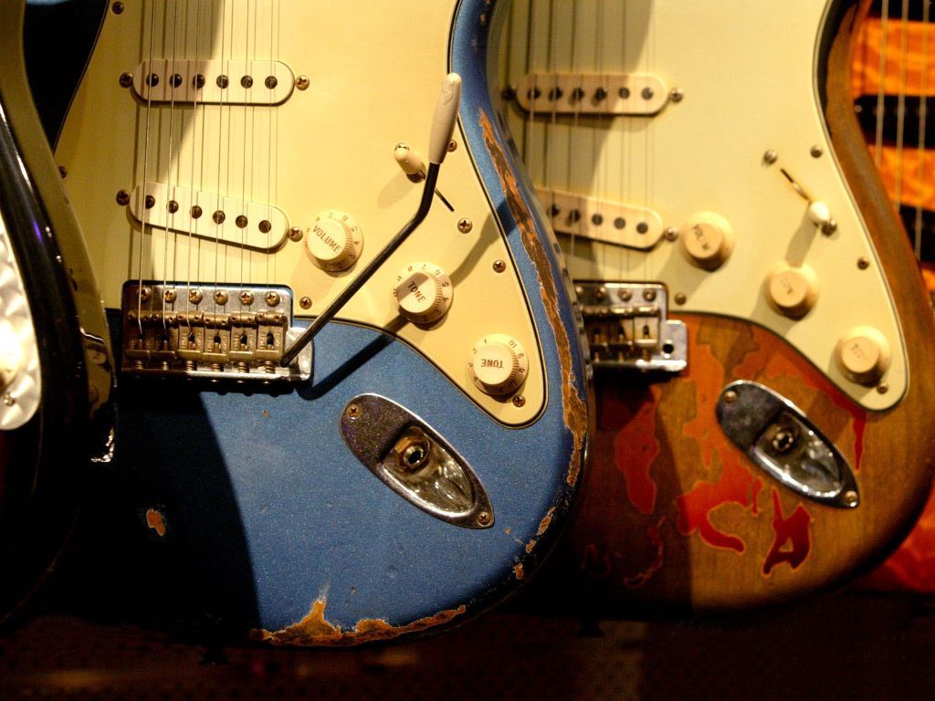 Description: A group of guitars sitting next to each other on a table with a guitar in the background and a guitar in the foreground.