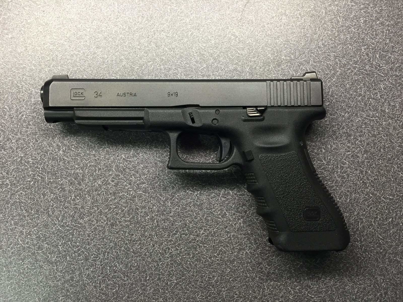 Description: A gun that is laying on a table top with a black handle and a black grip on it.