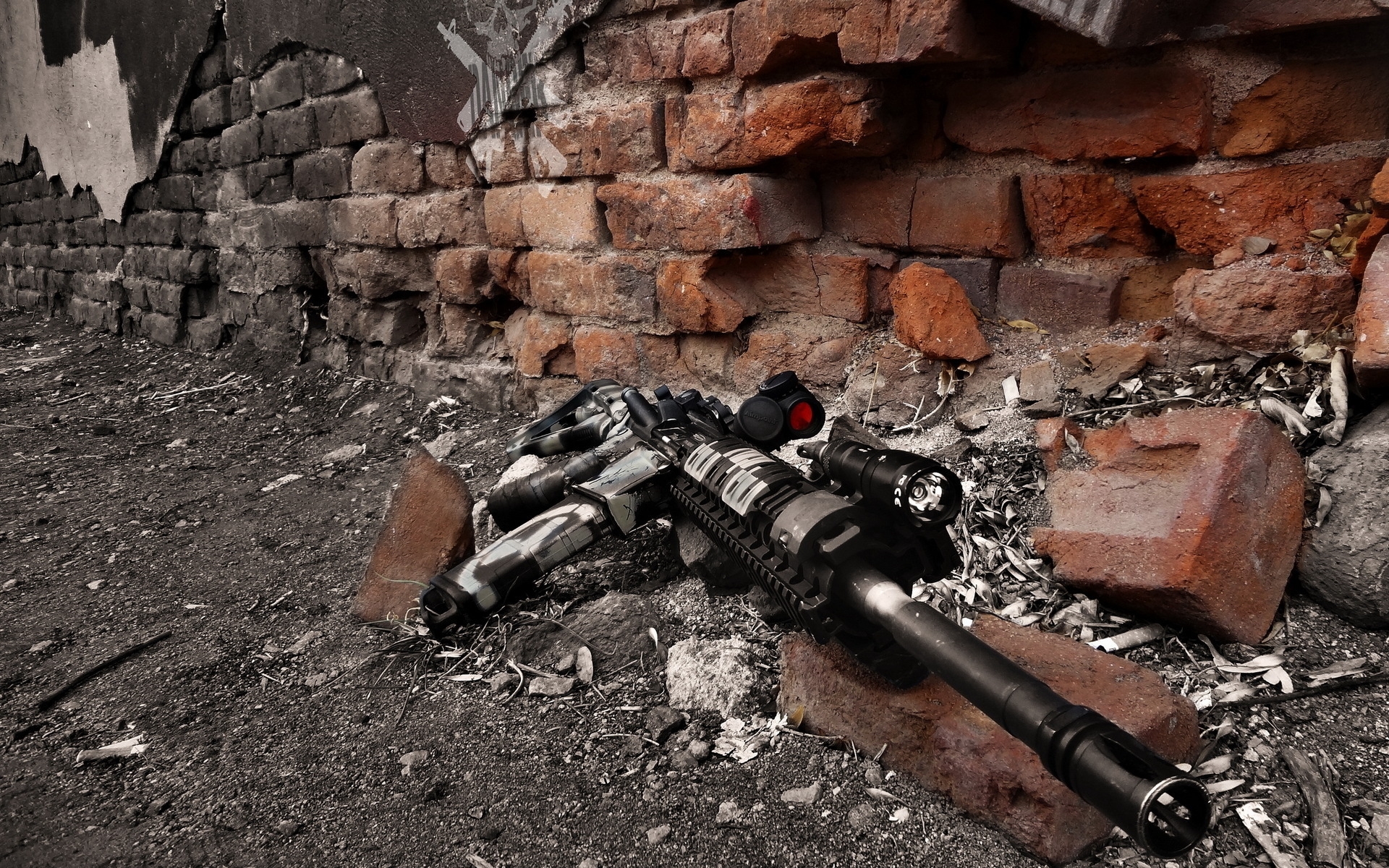 Description: A gun laying on the ground next to a brick wall and rubbleed wall with a brick wall behind it.