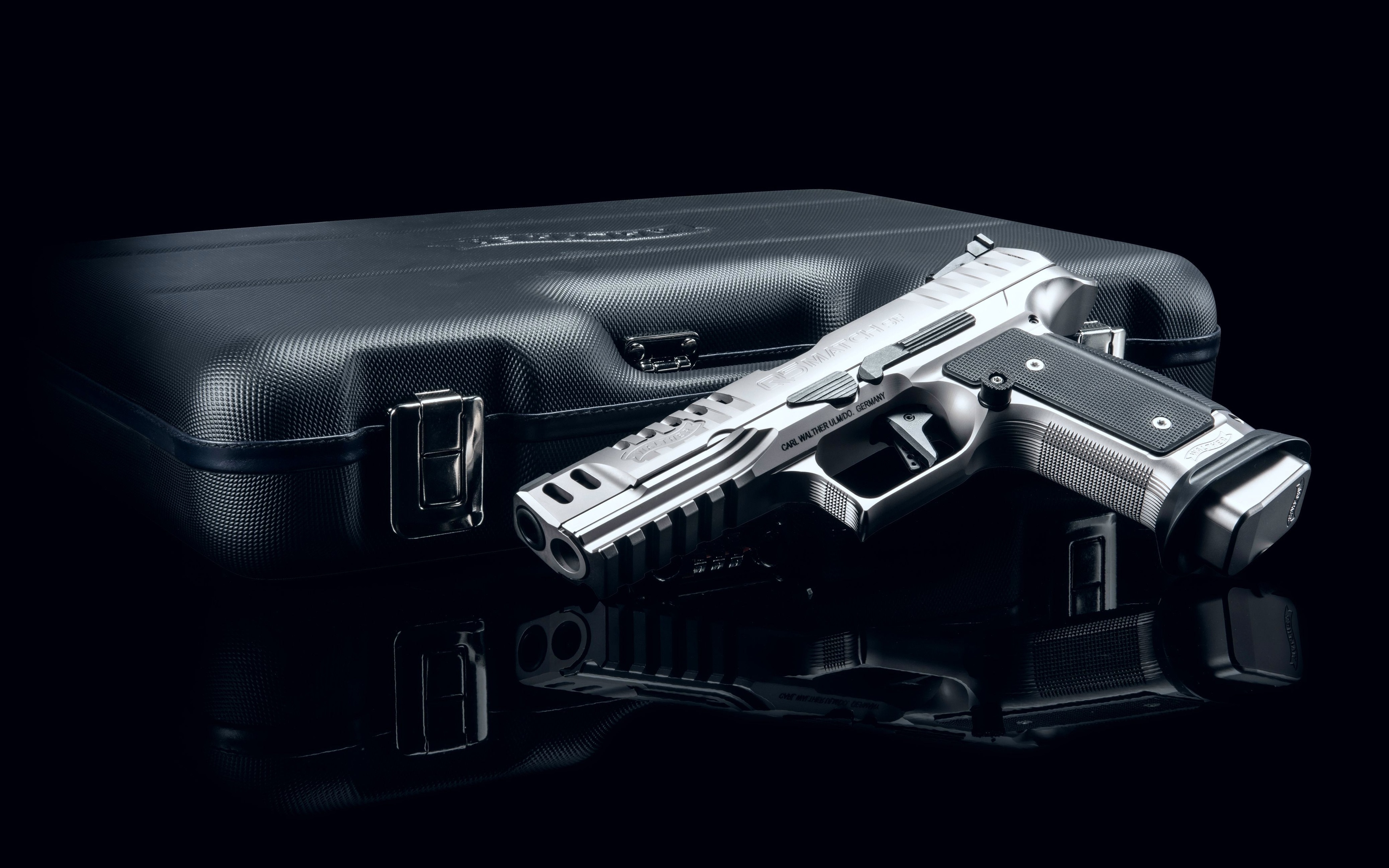 Description: A gun and a case on a black background with a reflection of it on the floor and a black background.