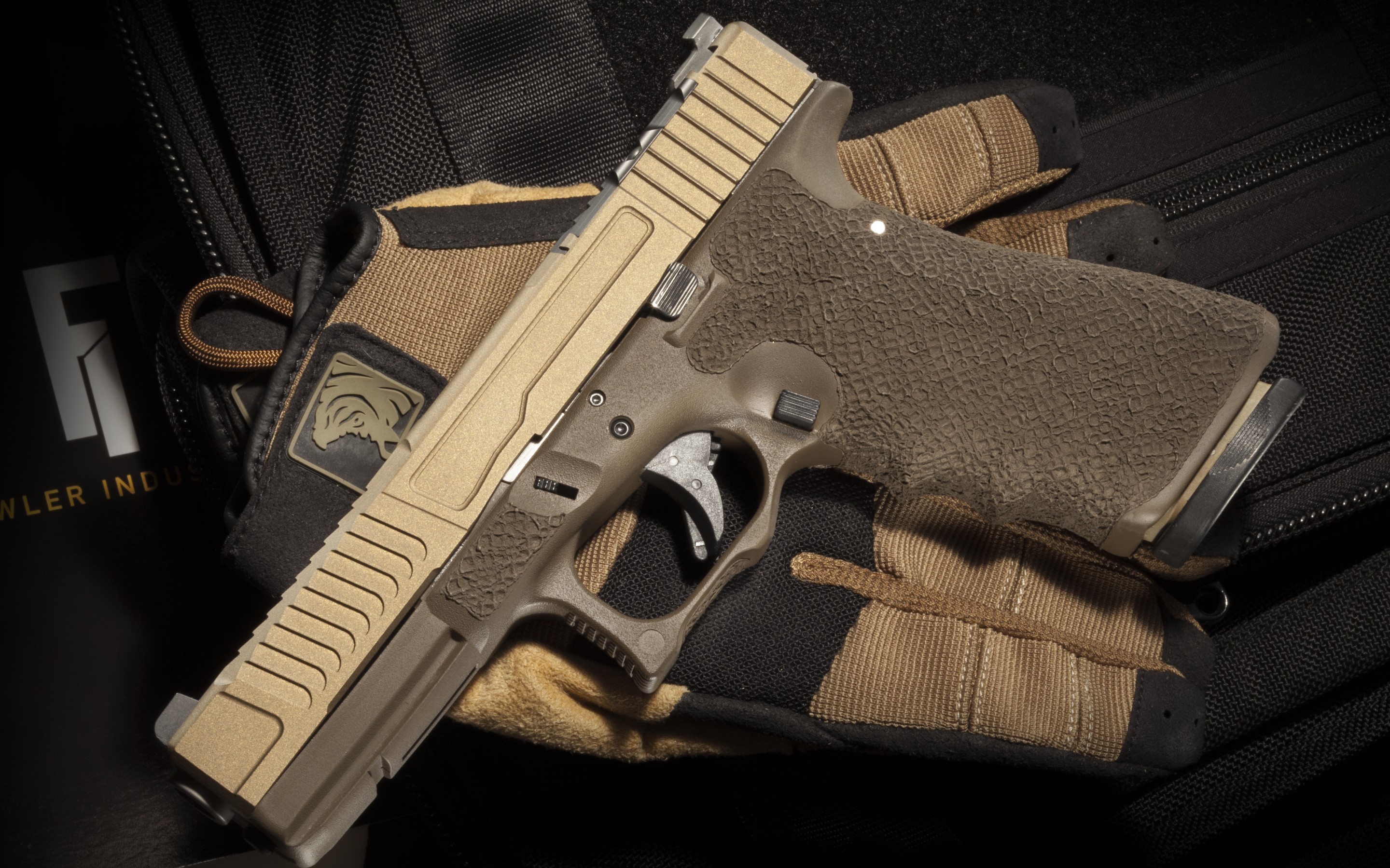 Description: A gun and a glove on a black background with a logo on it and a logo on the side of the gun.