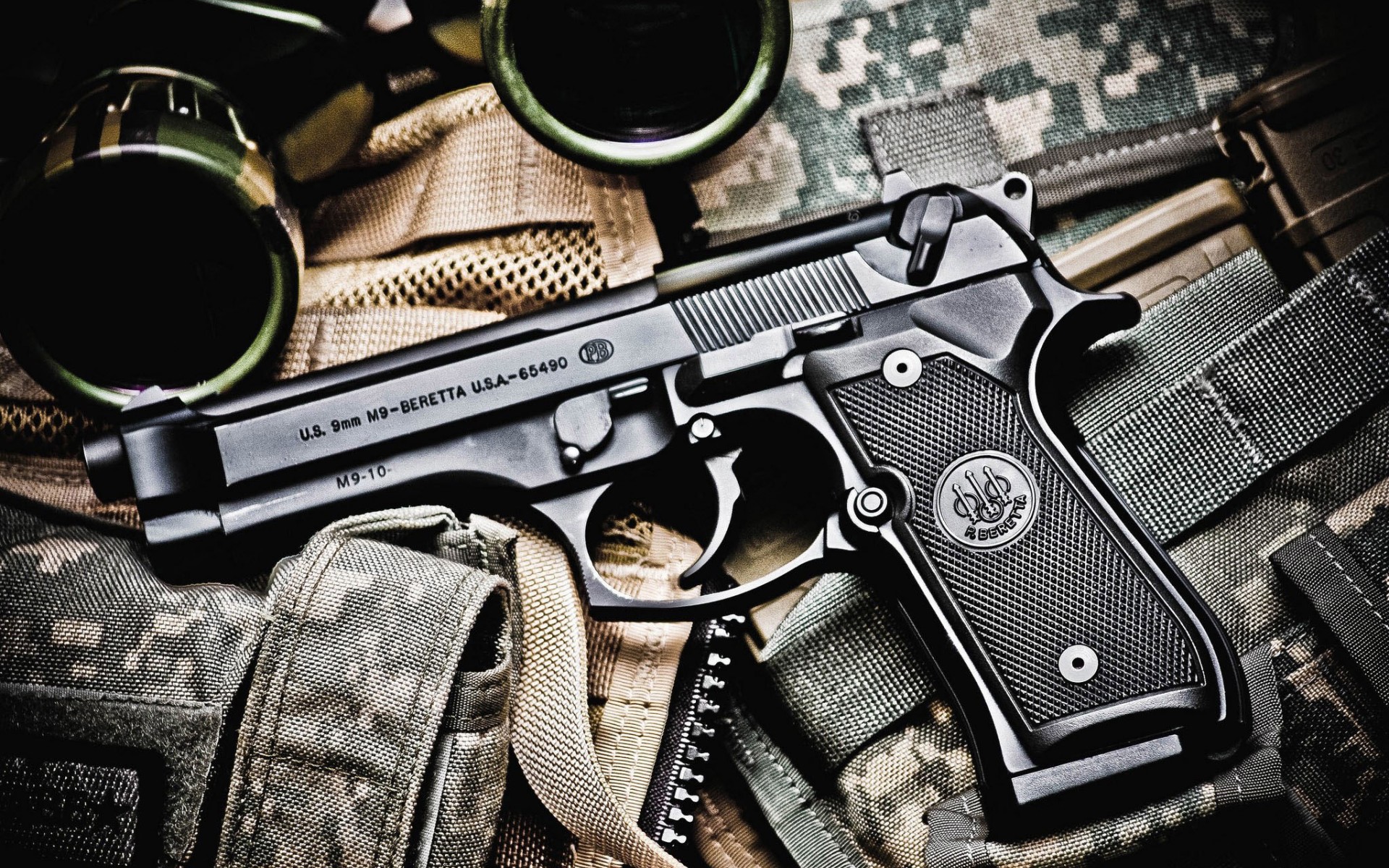 Description: A gun and goggles on a camouflage background with a pair of goggles on the side of the gun.