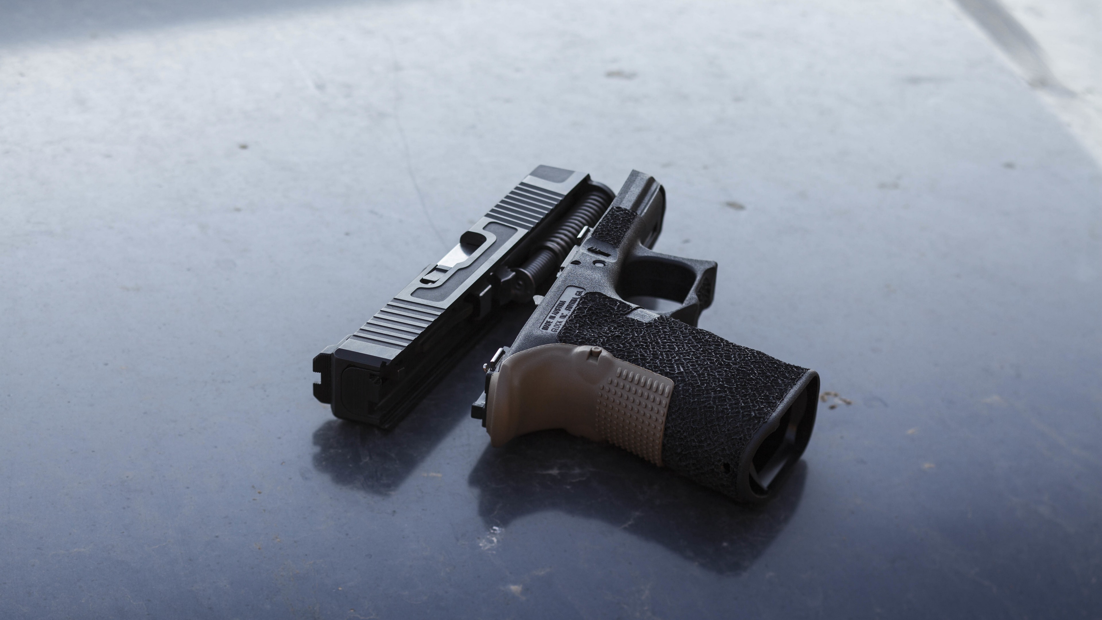 Description: A gun and a holster on a table top with a light on it's side and a lighter on the other side.