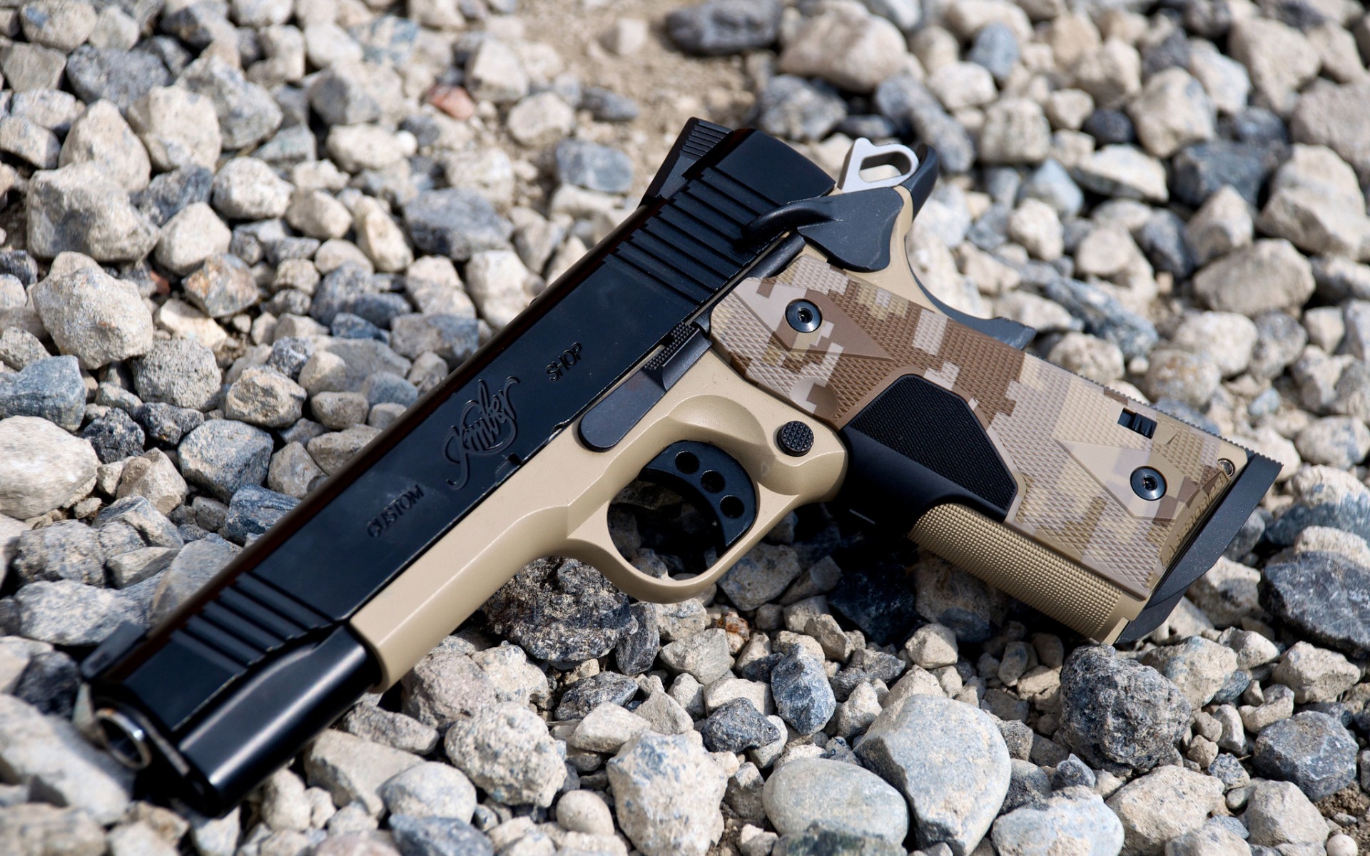 Description: A gun laying on a rocky ground with a camouflage pattern on it's side and the rest of the gun facing the camera.
