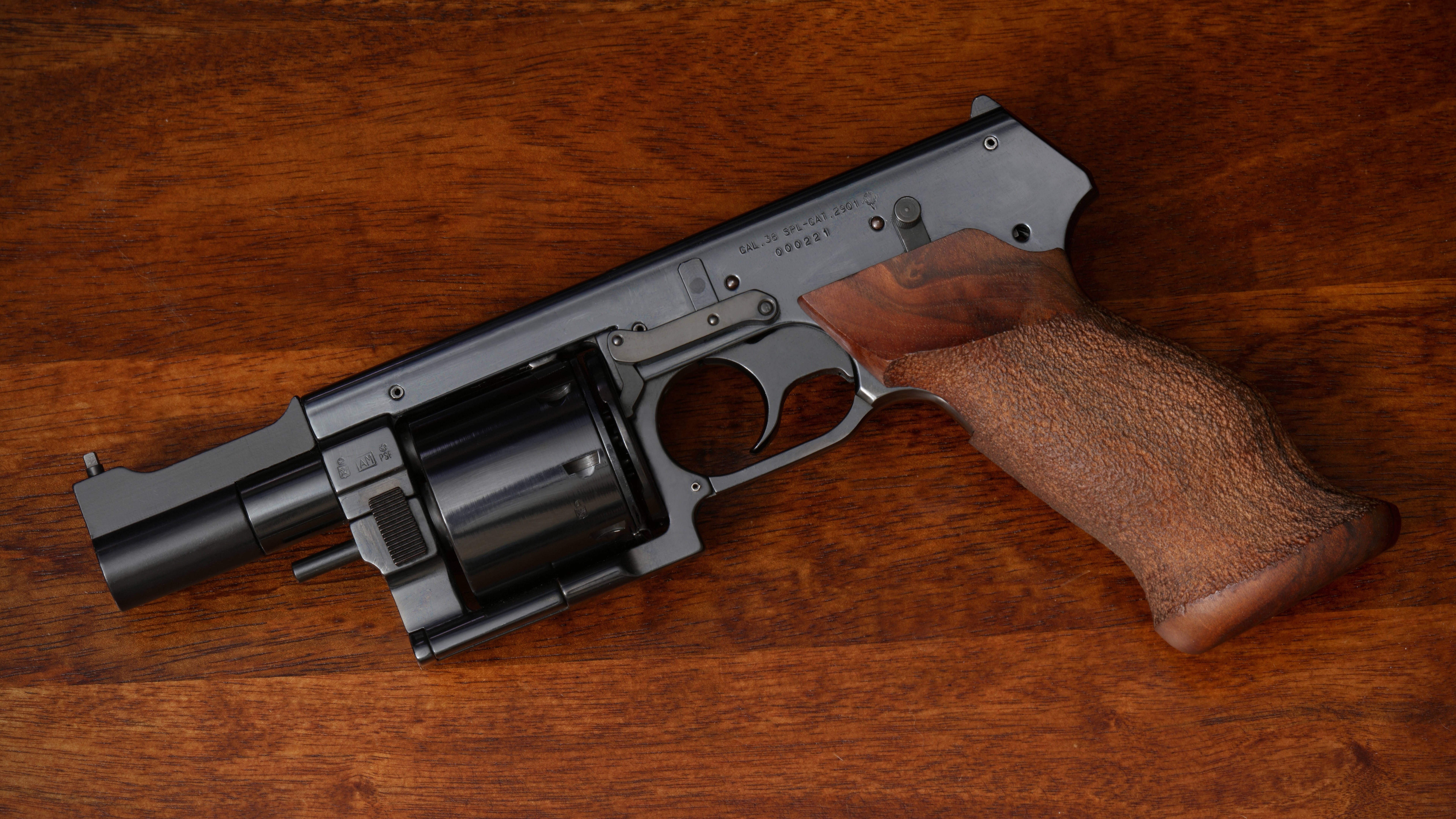 Description: A gun with a wooden barrel on a wooden table top with a wooden grips and a black barrel on the side.