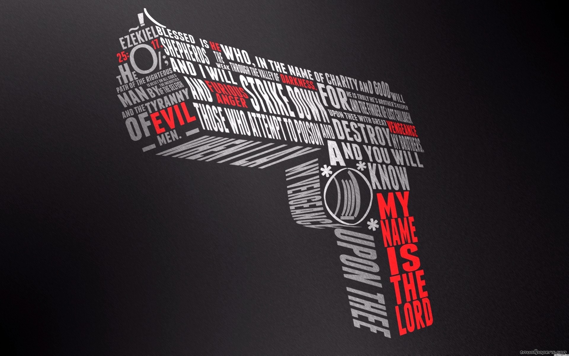 Description: A gun with words written on it in different languages on a black background with a red and white design.