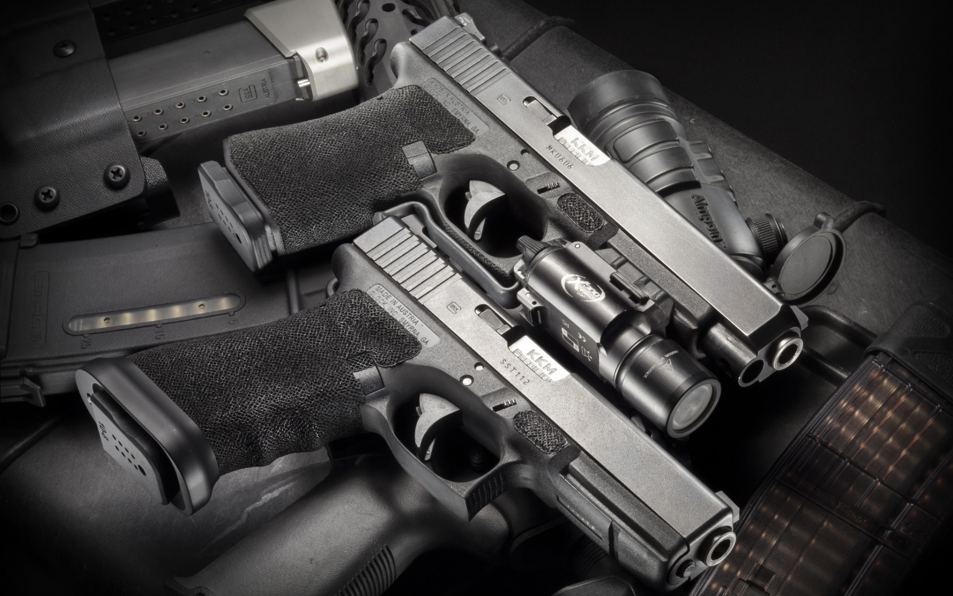 Description: A group of guns and a gun case on a table with other guns and accessories on it.