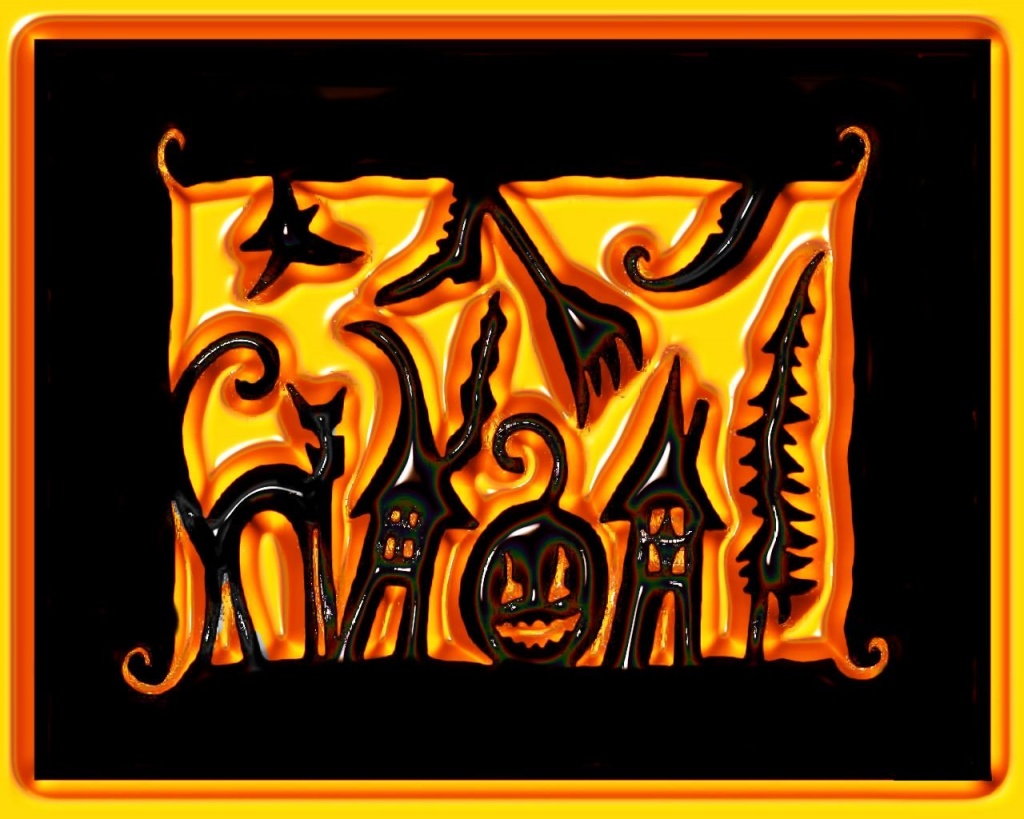 Description: A black and yellow picture of a halloween scene with a pumpkin and a ghost on it's face.