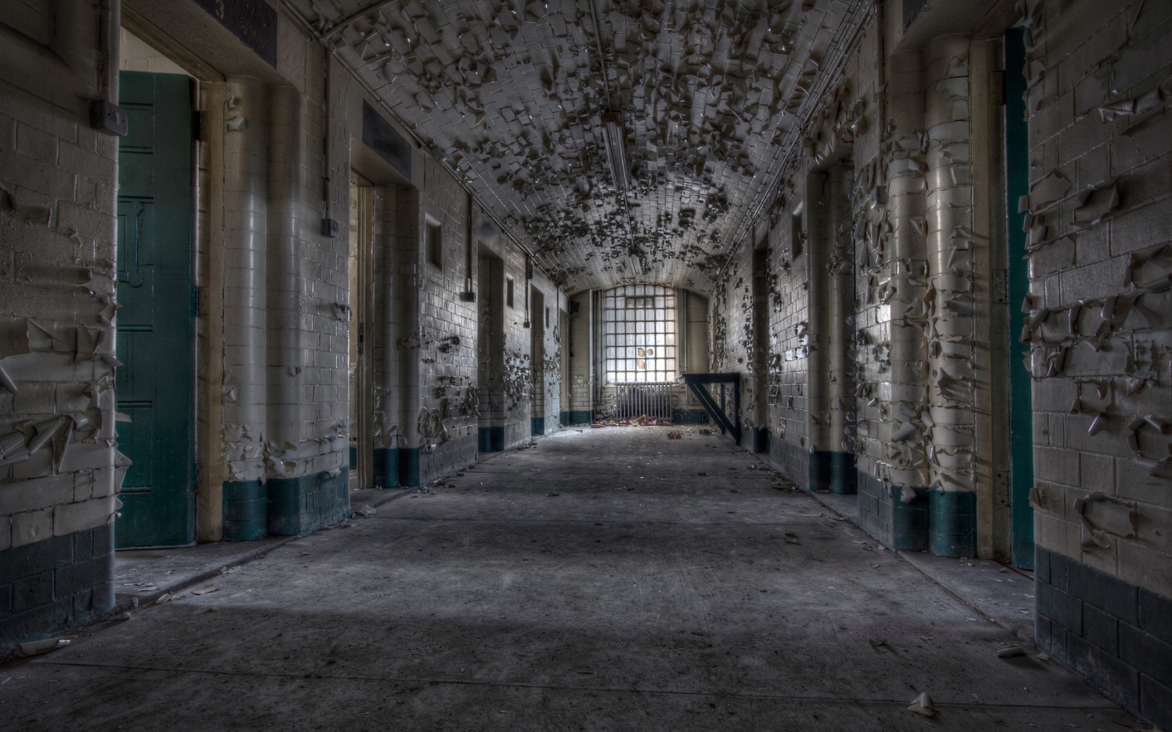 Description: A long hallway with a bunch of windows and a bunch of graffiti on the walls and ceiling of the room.