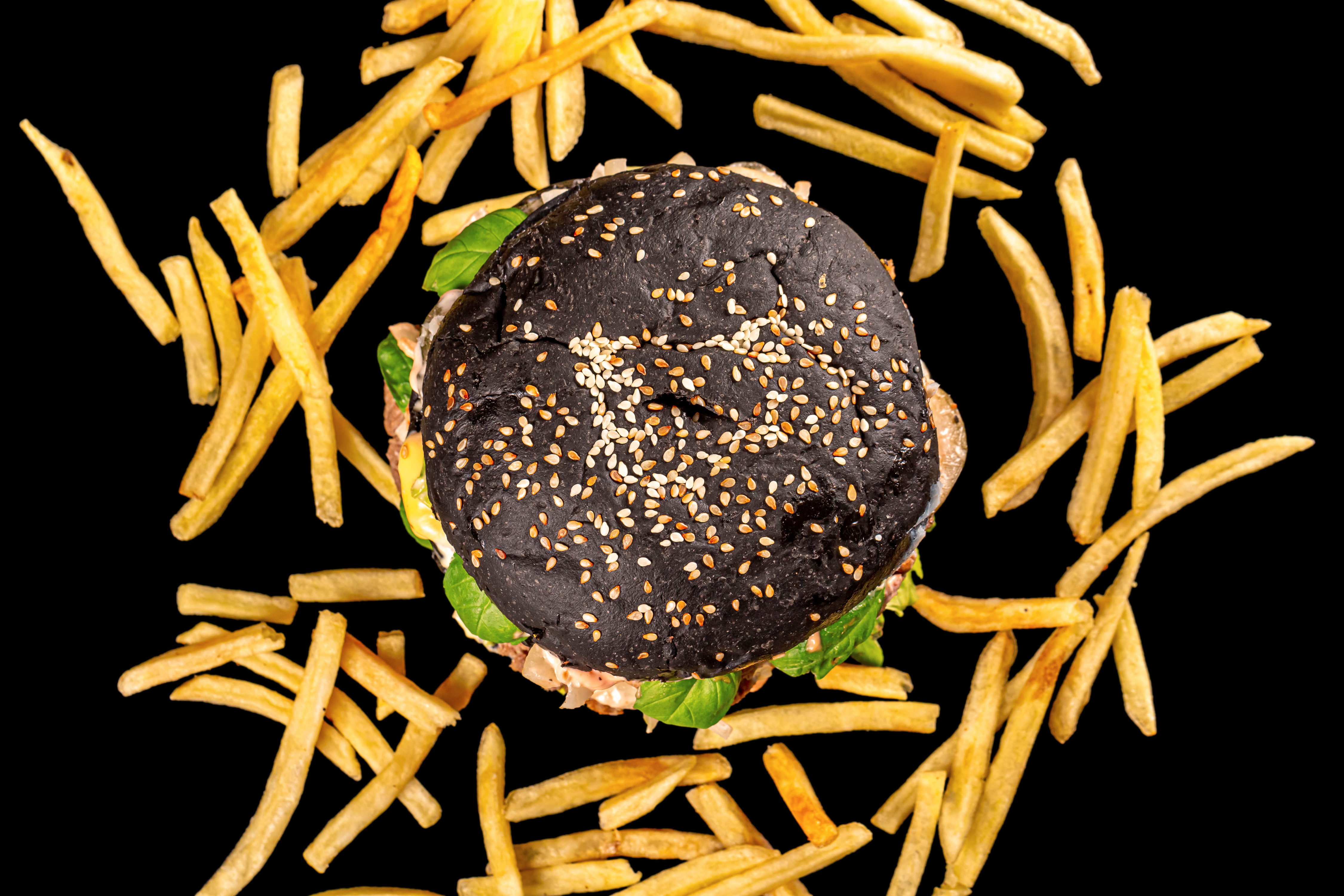 Description: A hamburger and fries are on a black surface with a black background and a black background with a black background.
