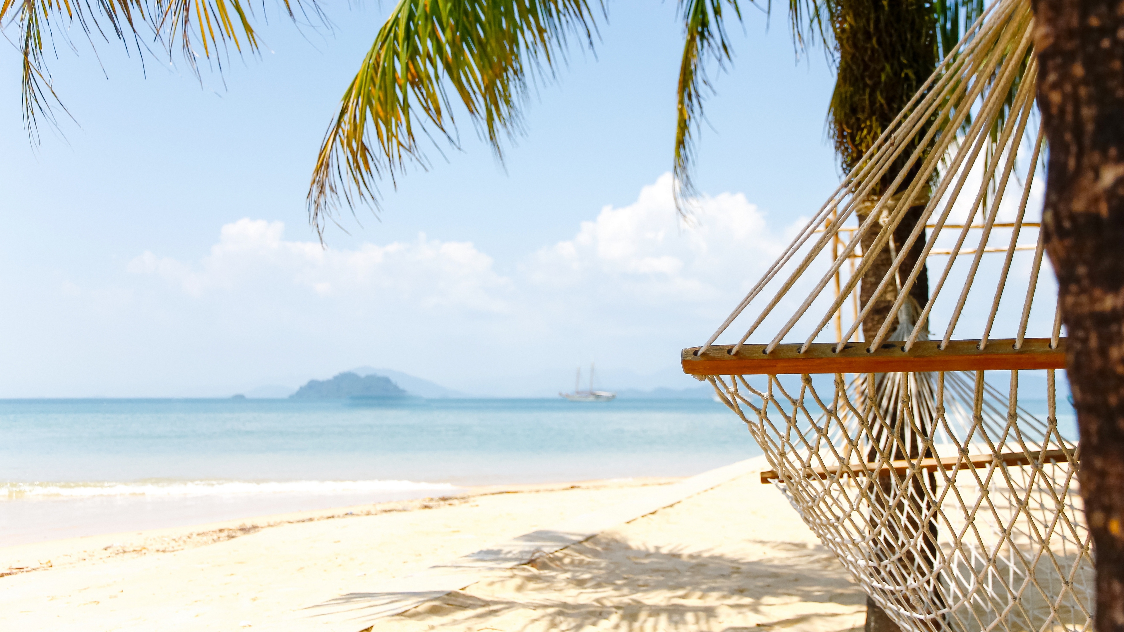 Description: A hammock on a beach with a sailboat in the distance and a palm tree in the foreground.