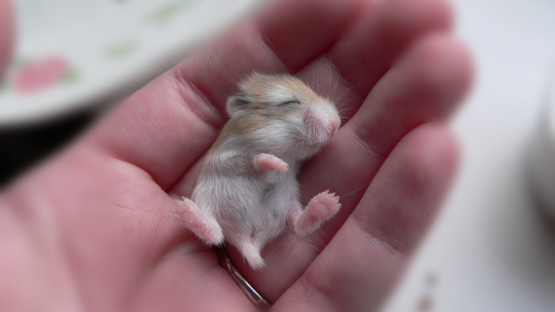 Description: A small hamster is sitting in a persons hand with a pair of scissors in it's palm.