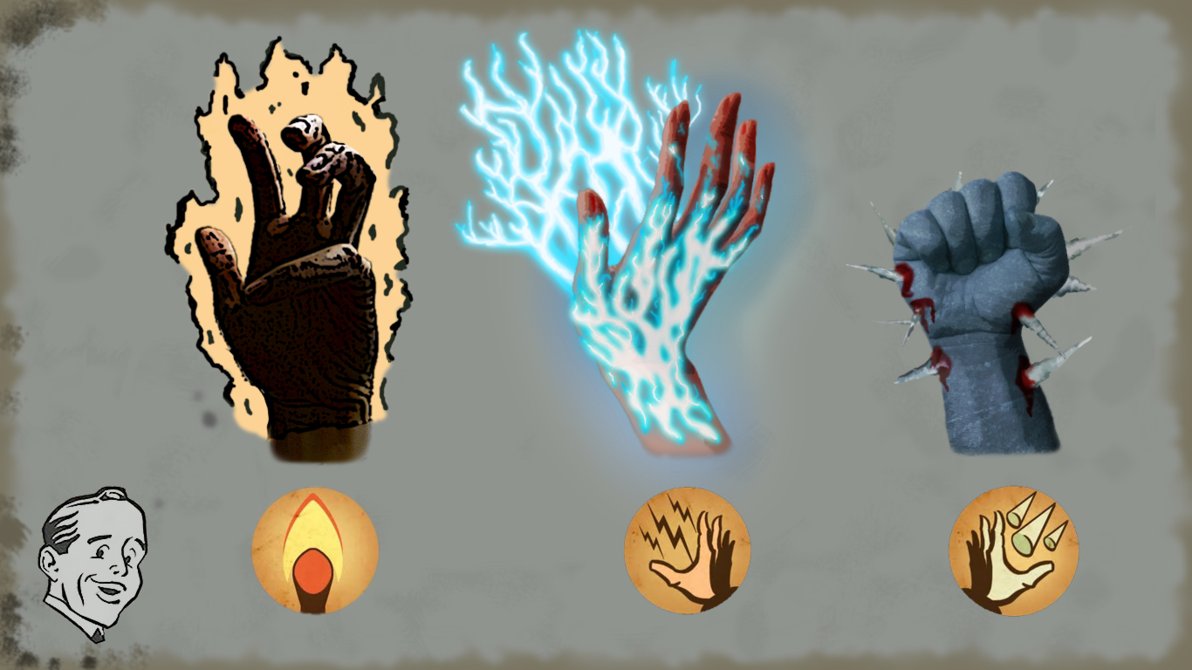 Description: A drawing of a hand with a flame coming out of it and a hand with a demon on it.