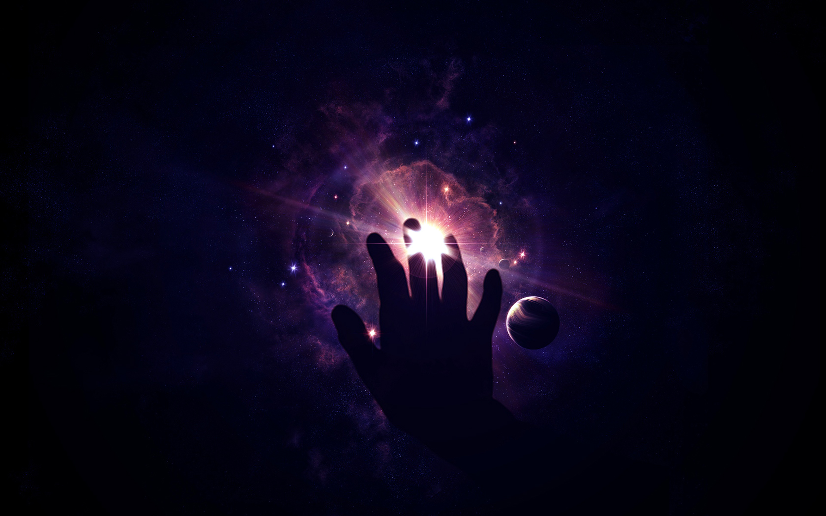 Description: A hand reaching for a ball of light in the dark sky with stars and planets in the background.