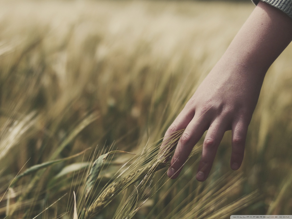 Description: A hand reaching for a grain in a field of wheat in a sepia tone photo of a hand reaching for a grain in a field of wheat.