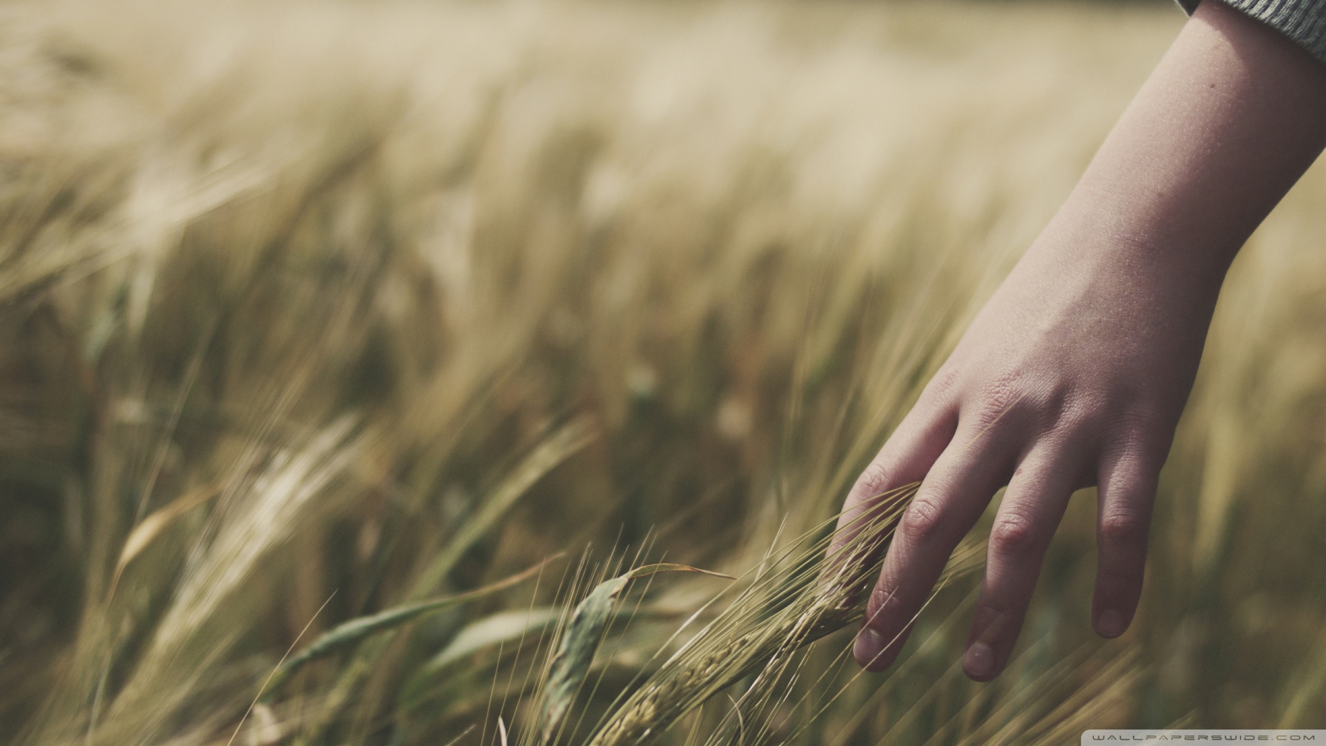 Description: A hand reaching for a grain in a field of wheat in a sepia tone photo of a hand reaching for a grain in a field of wheat.