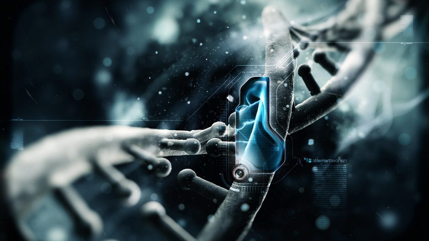 Description: A digital image of a hand touching a blue object with a black background and a white background with a blue structure.