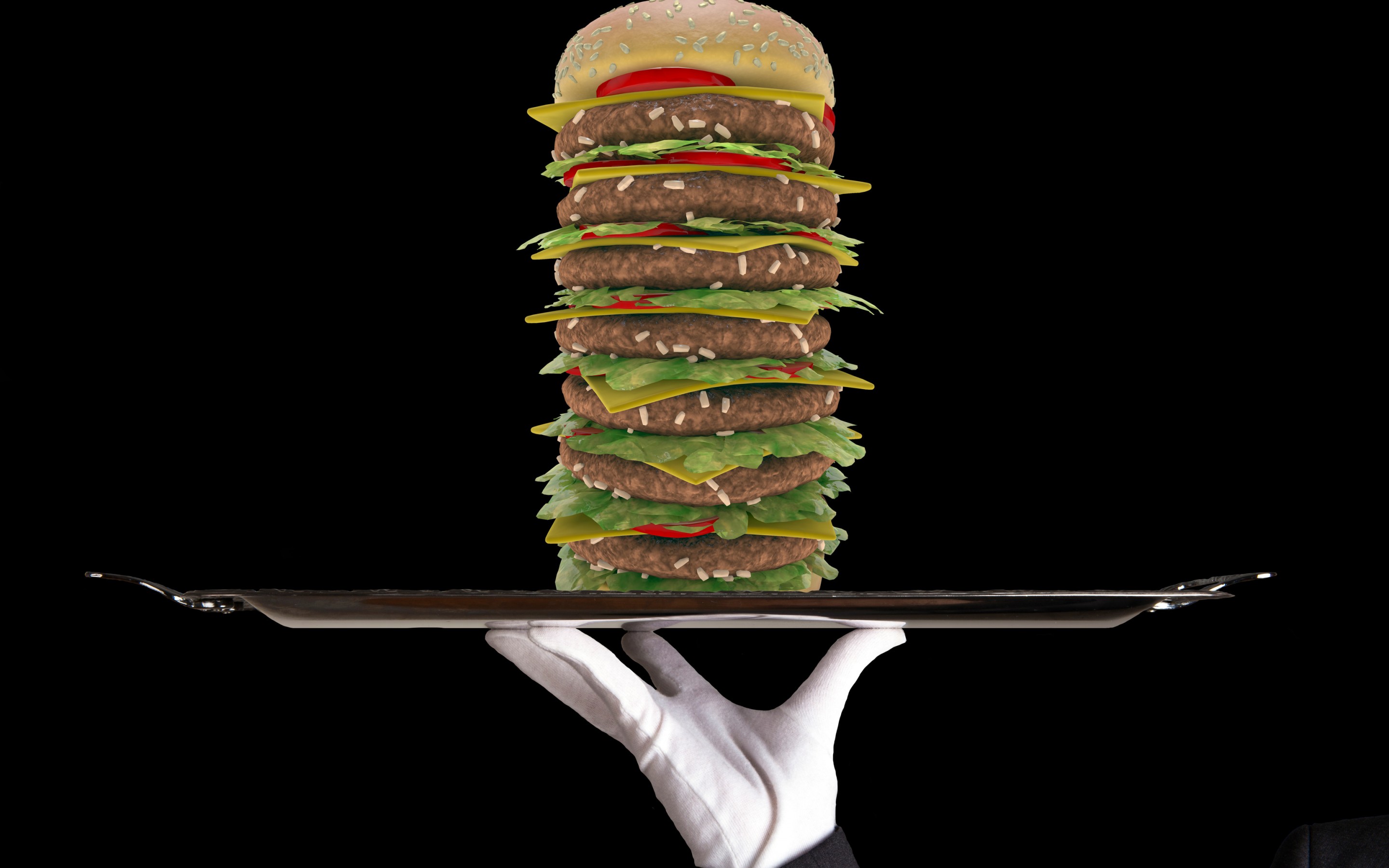 Description: A hand holding a tray with a large hamburger on it and a giant hamburger on top of it.