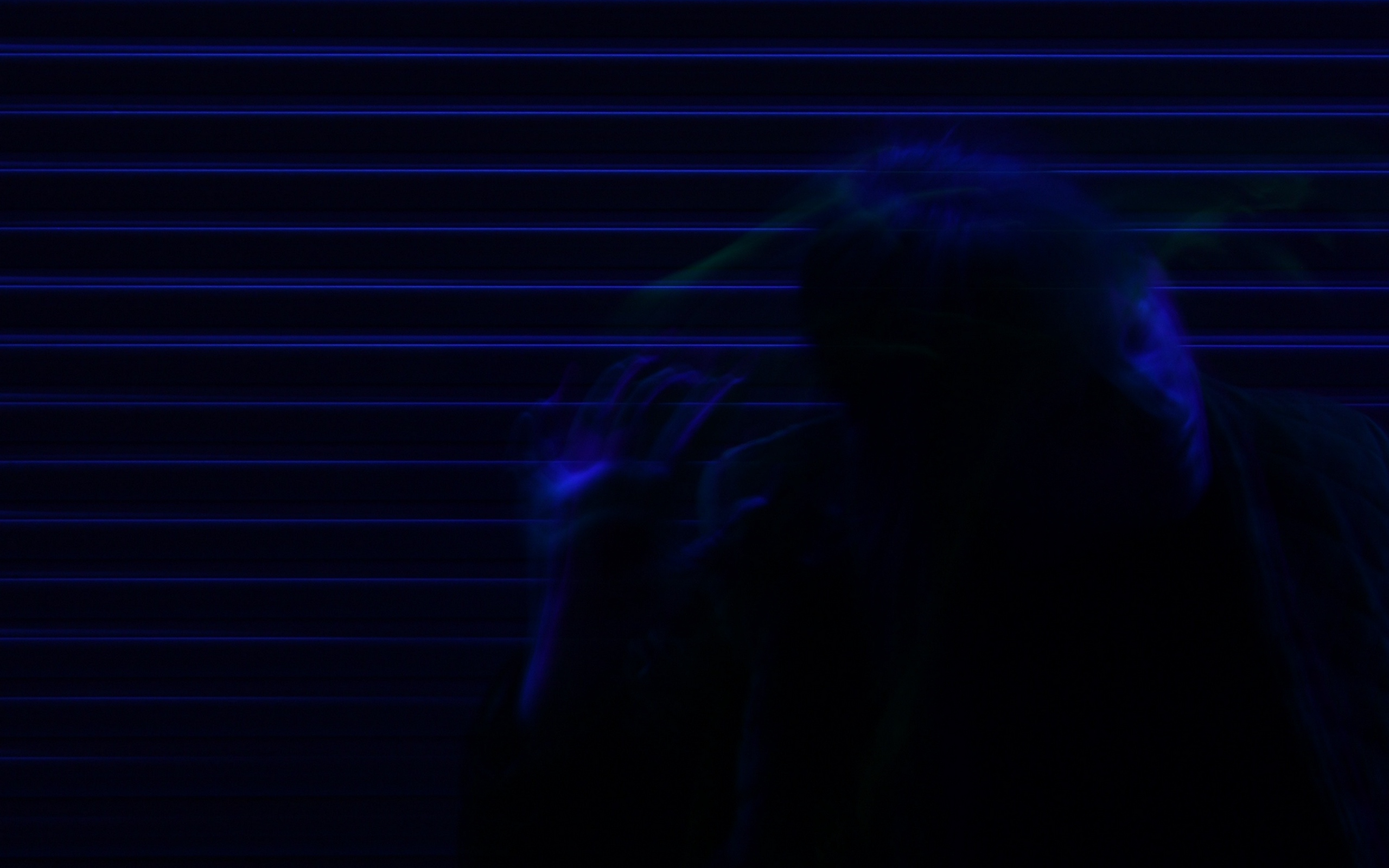 Description: A person with their hands up in the air in front of a blue background with horizontal lines of light.