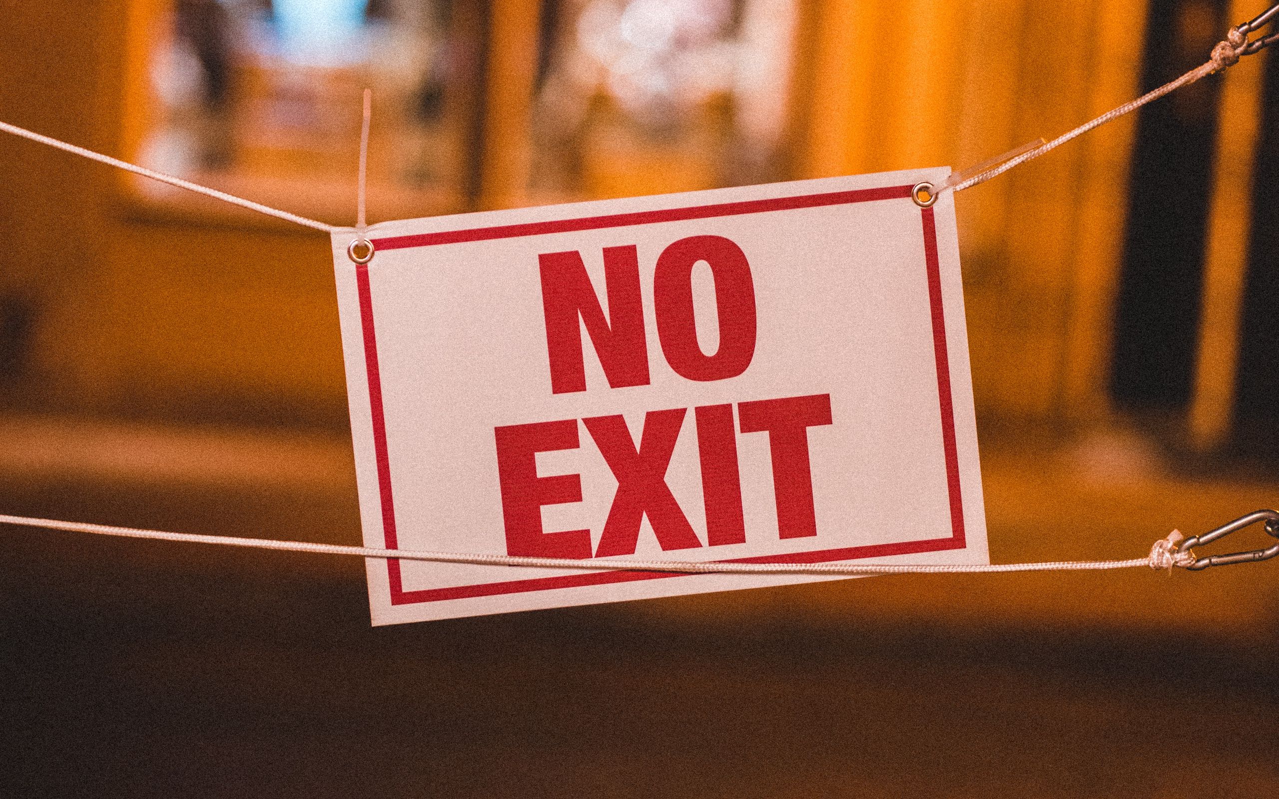 Description: A sign that is hanging on a wire with a no exit sign on it that says no exit on it.