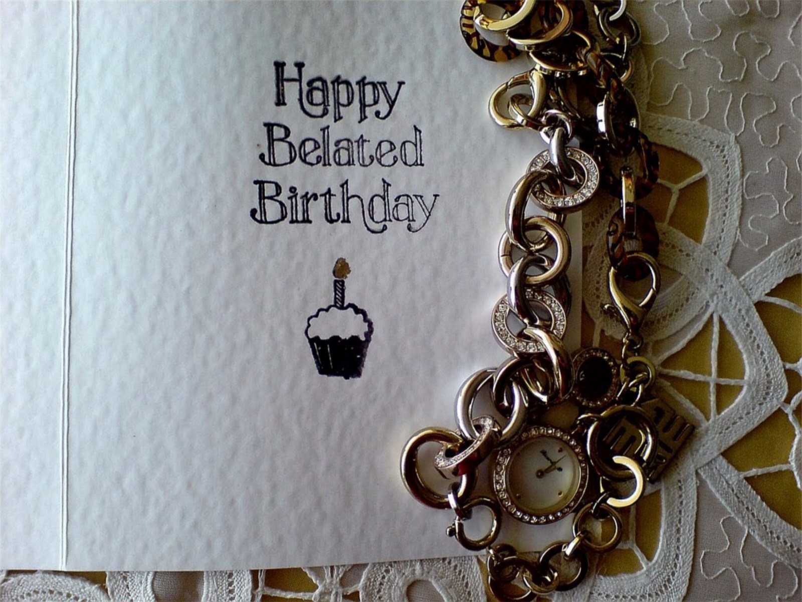 Description: A card with a chain around it that says happy beleated birthday on it and a cupcake on it.