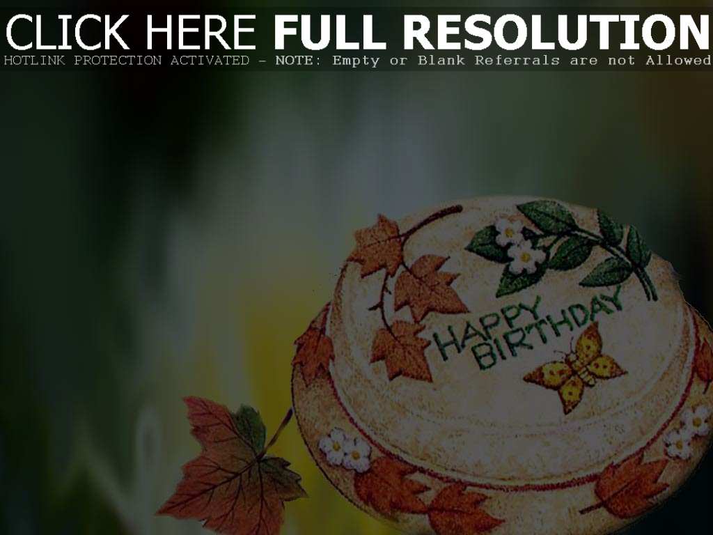 Description: A cake with a happy birthday message on it is shown in this picture with leaves and flowers on it.