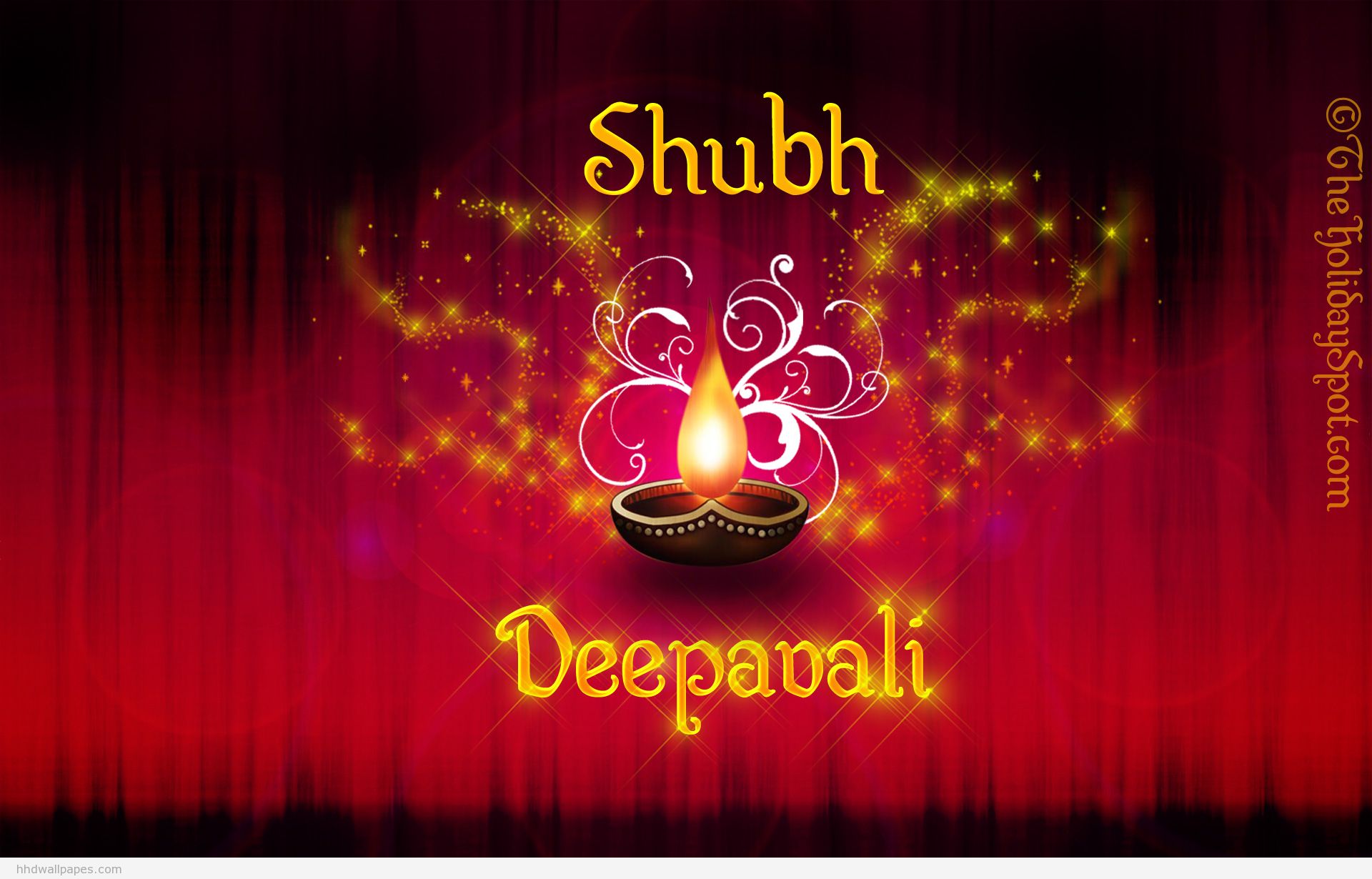 Description: A happy diwali greeting card with a lit candle on a red background with a red curtain and a red curtain.
