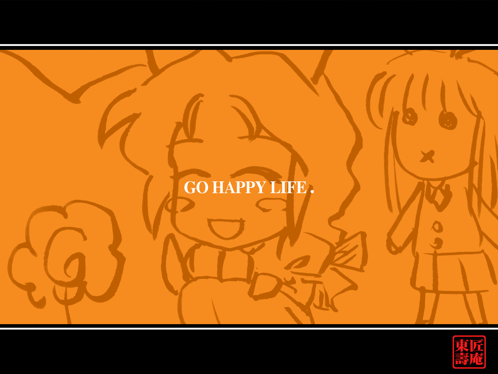 Description: A drawing of two girls with a caption that says go happy life on it's screen and a drawing of a girl with a cat.