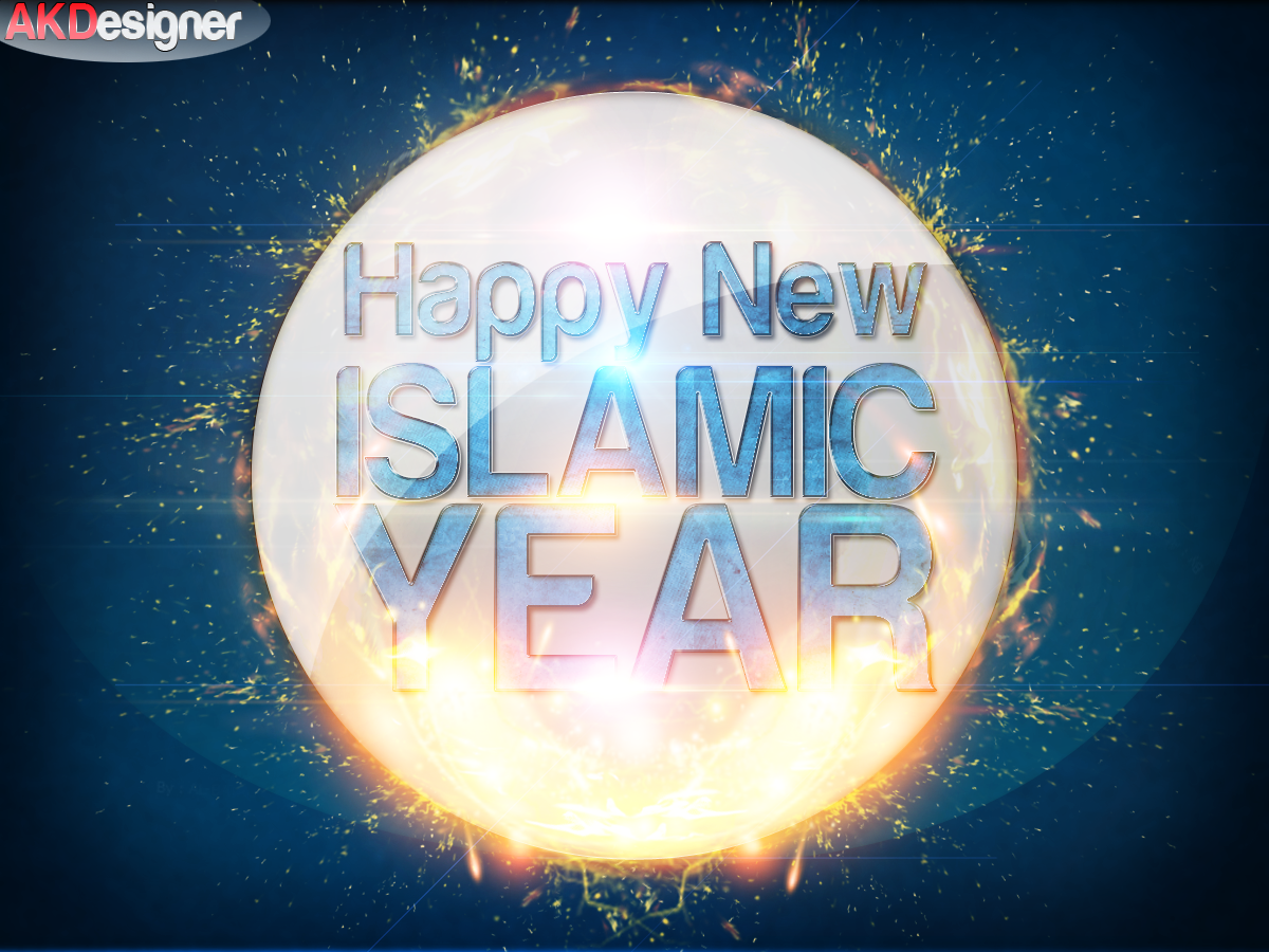 Description: A happy new islamic year text on a blue background with fireworks and a ball of fire in the middle.
