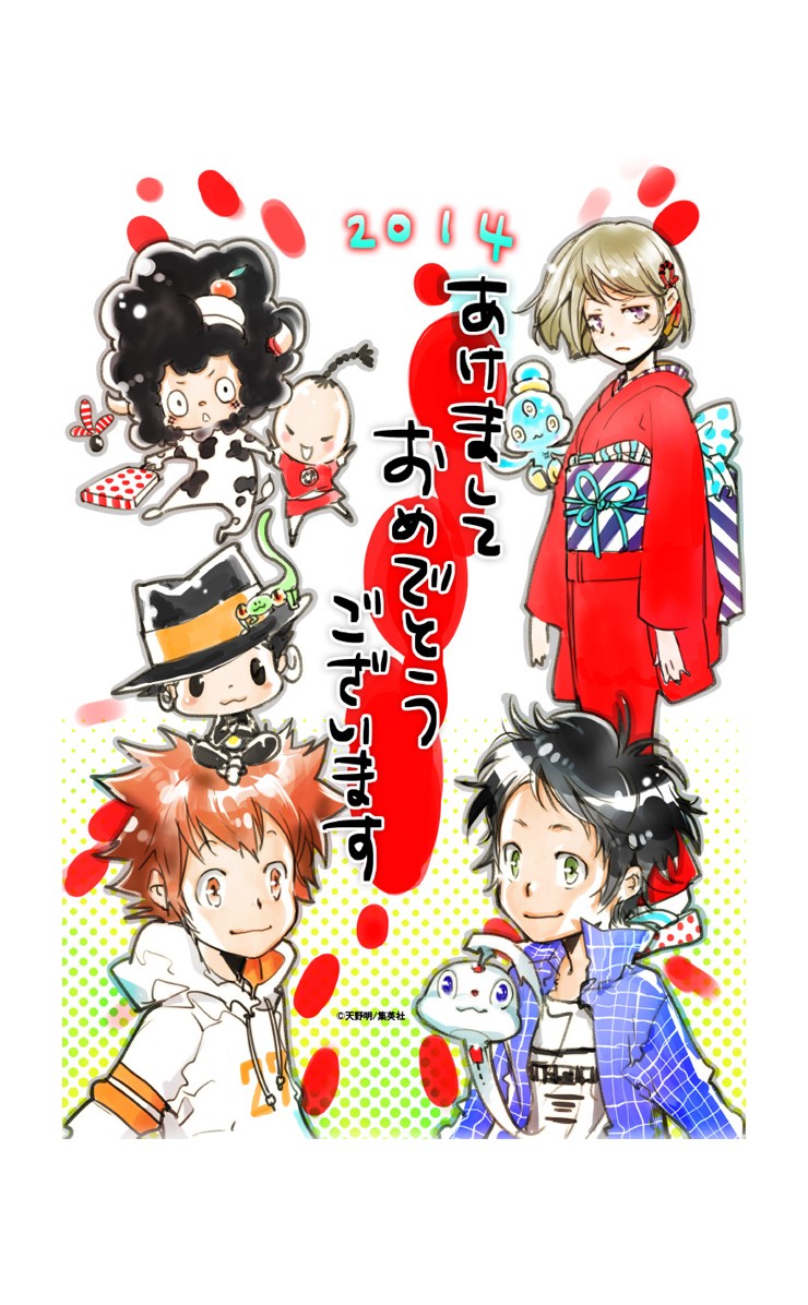 Description: A group of people with anime characters on them and a red background with the words happy new year written in japanese.
