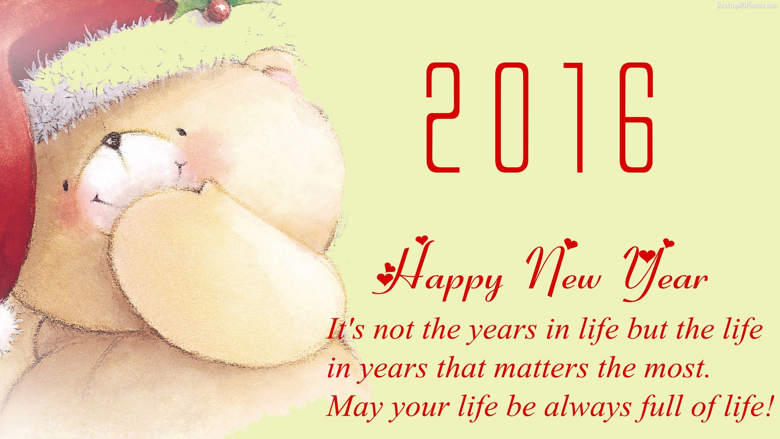 Description: A happy new year greeting card with a teddy bear wearing a santa hat and holding a red ribbon on a green background.