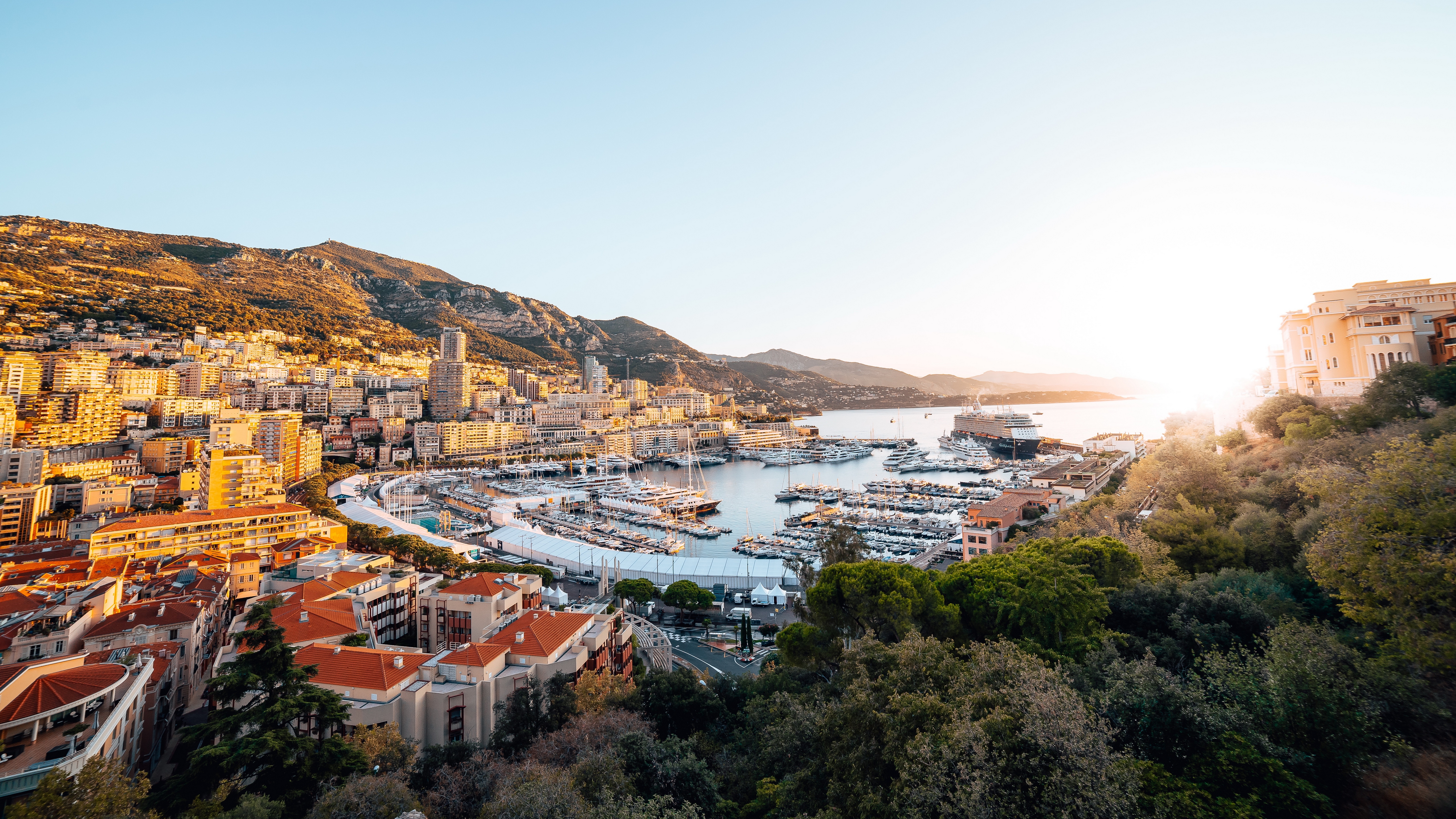 Description: A city with a harbor and a lot of boats in it and a mountain in the background with a sun shining on the city.