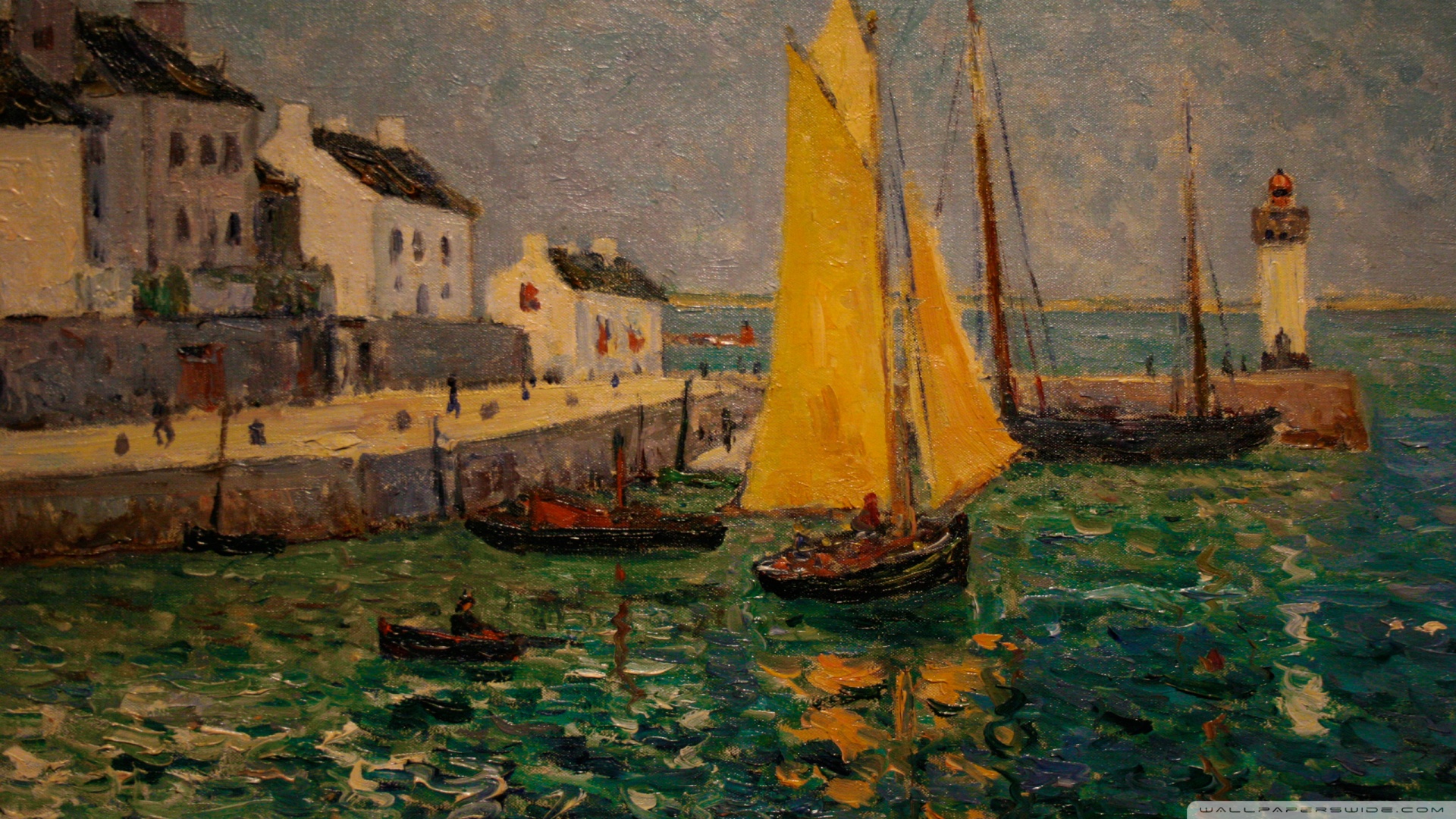 Description: A painting of a harbor with boats and houses in the background and a lighthouse in the distance with a yellow sailboat in the foreground.