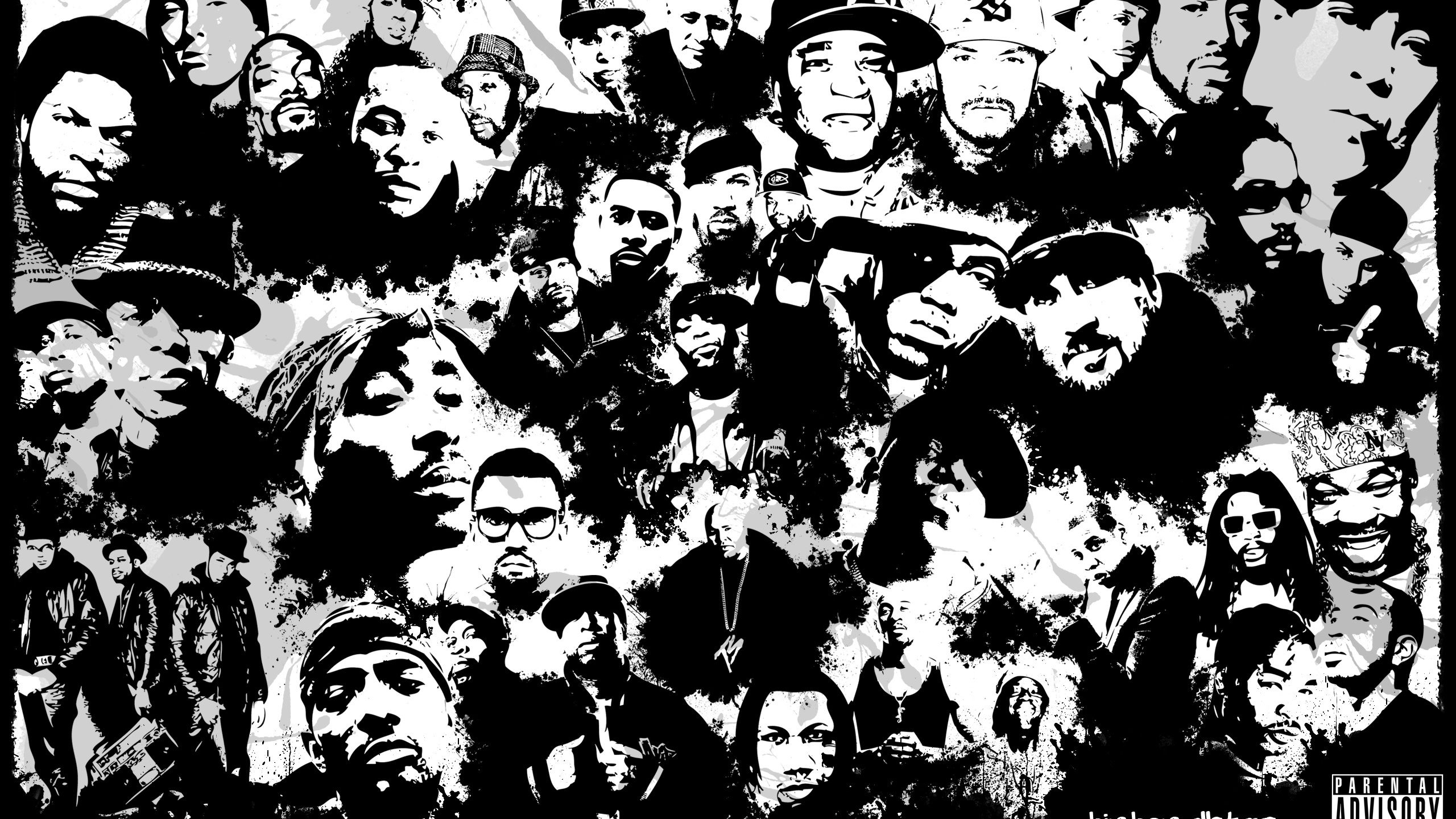 Description: A group of people with faces drawn on them in black and white ink on a black background with a white border.