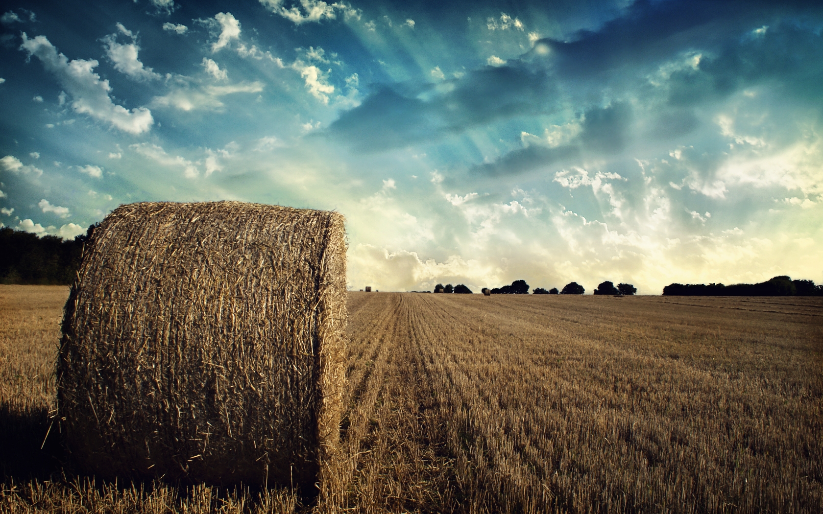 Description: A large hay bale in a field under a cloudy sky with clouds in the background and a blue sky with white clouds.