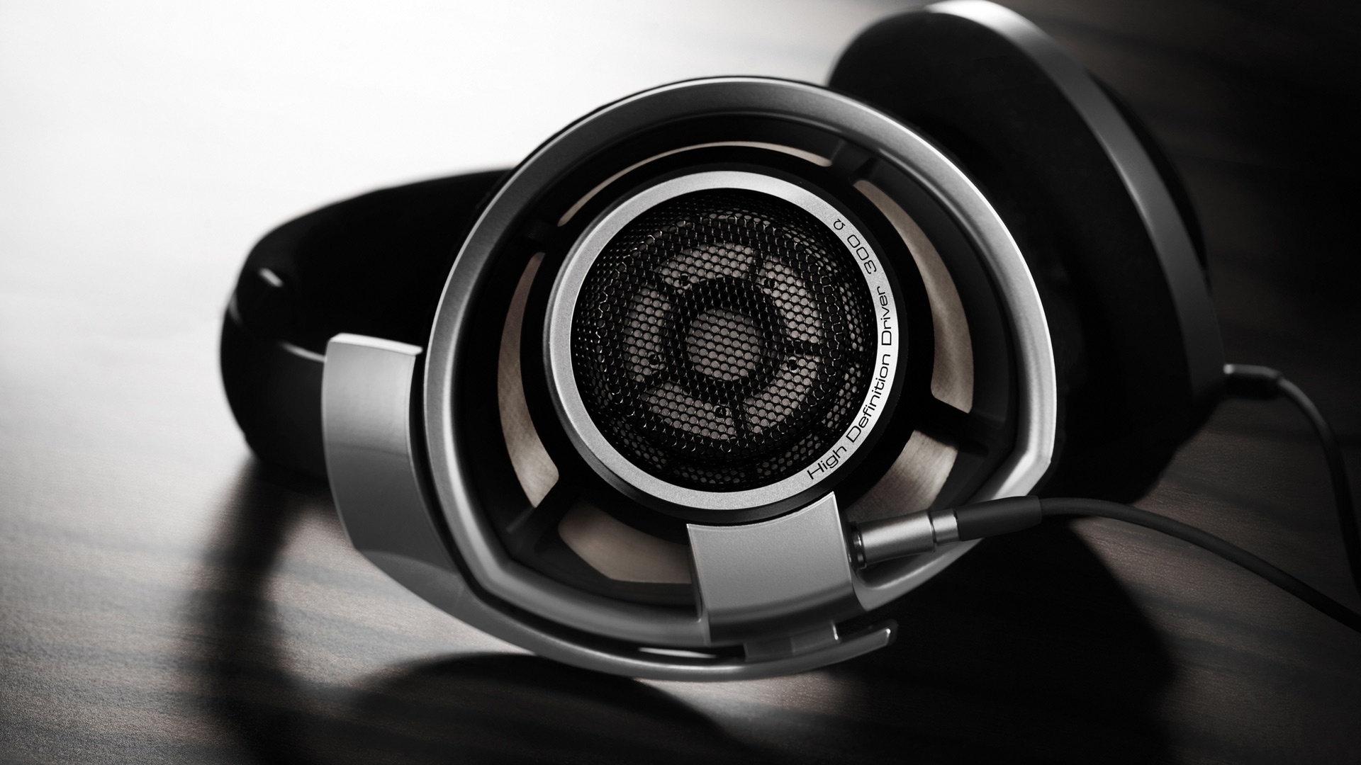 Description: A close up of a pair of headphones on a table with a black background and a white and black logo.