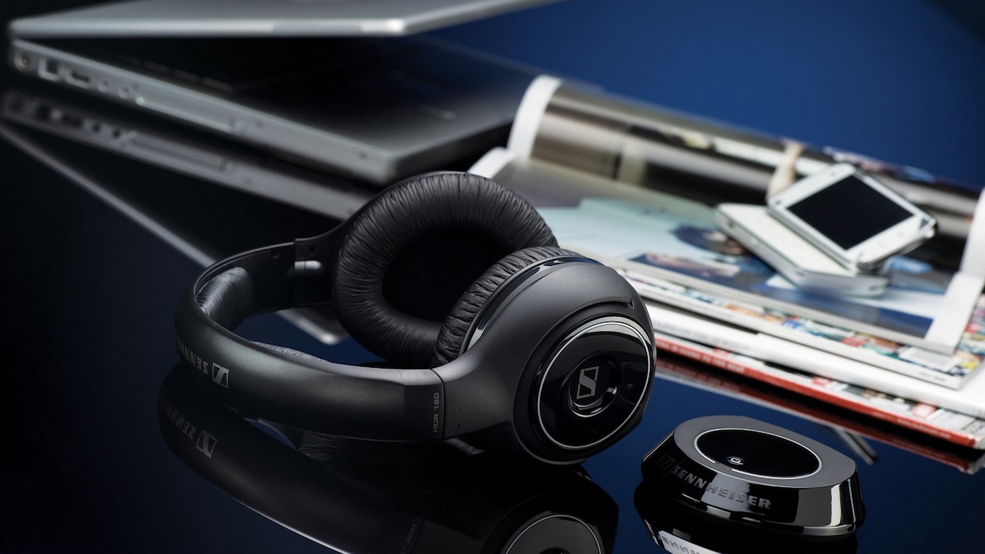 Description: A pair of headphones sitting on top of a table next to a laptop computer and a magazine with a cell phone.
