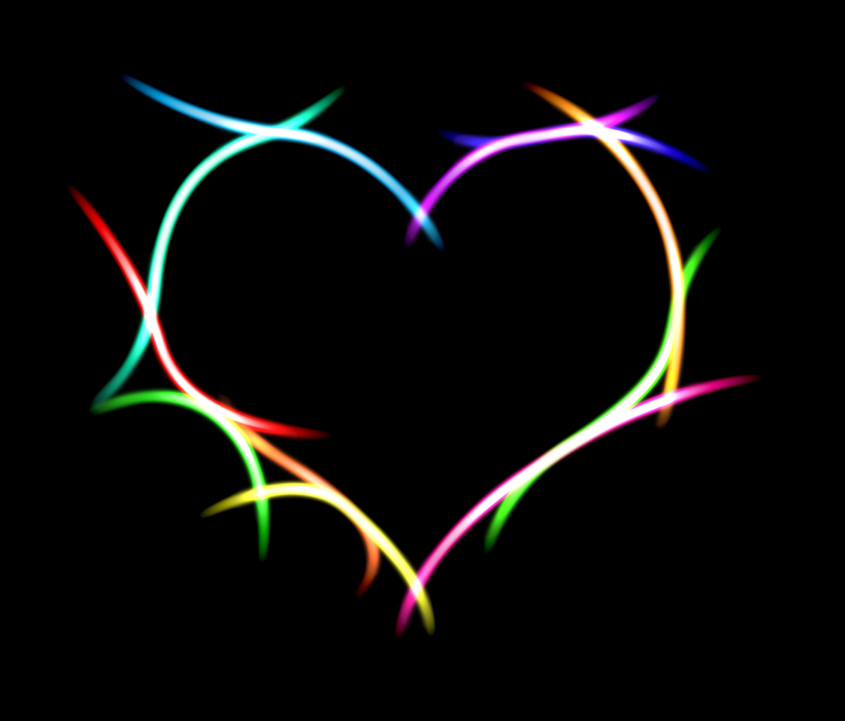 Description: A heart shaped object with a black background and a rainbow colored lightening effect on the top of it.
