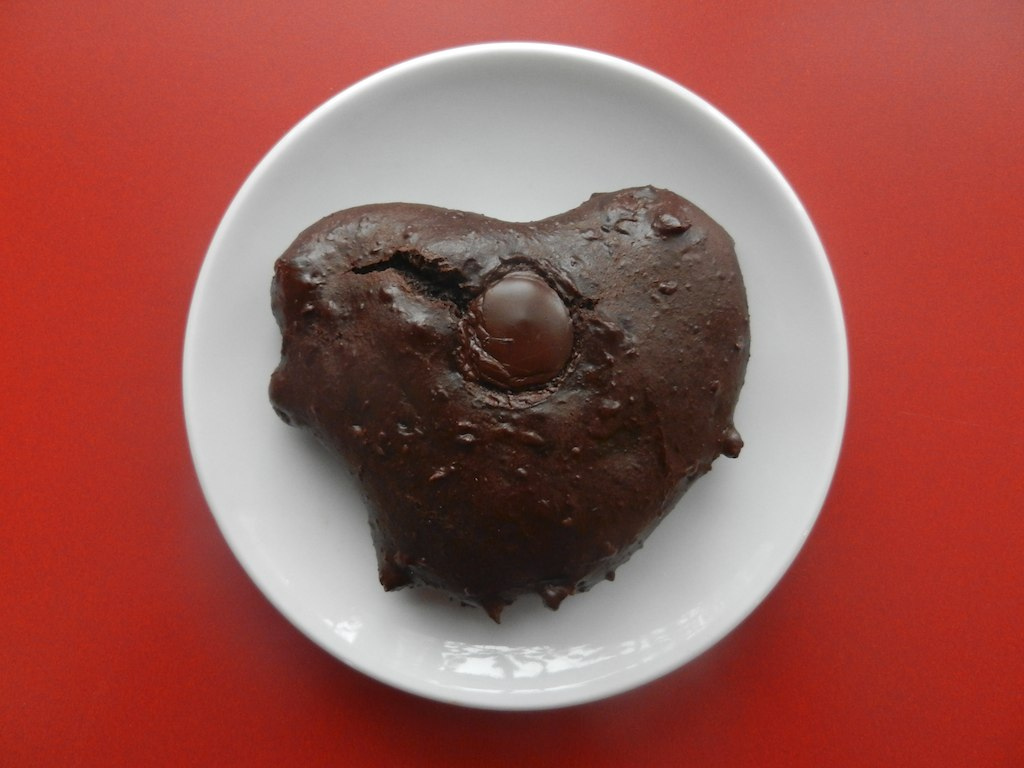 Description: A heart shaped chocolate cookie on a white plate on a red table top with a bite taken out of it.