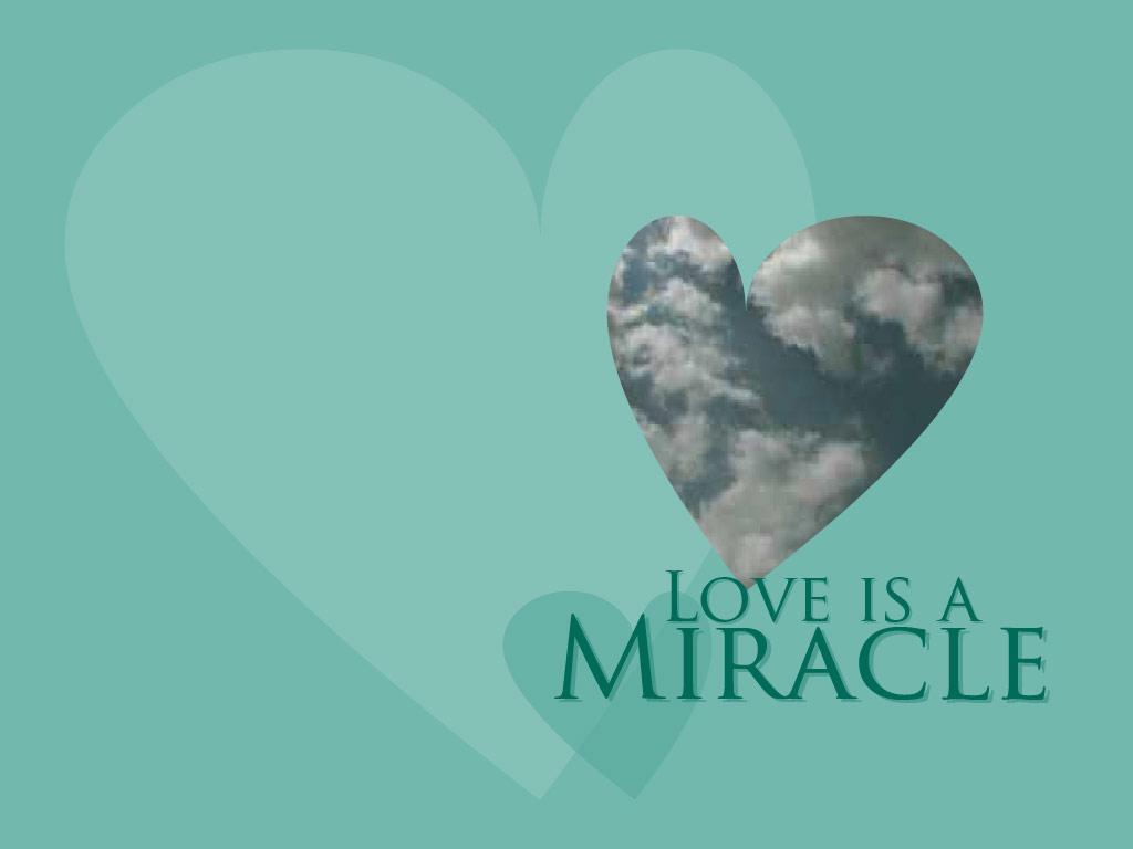 Description: A heart shaped cloud with the words love is a miracle on it's side and a sky background.