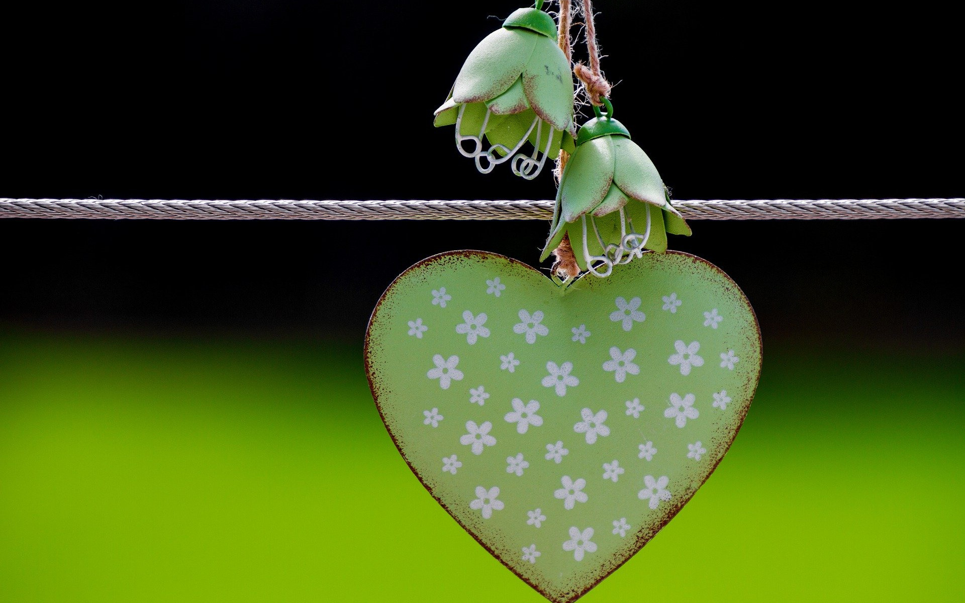 Description: A heart shaped cookie hanging from a line with a string attached to it with two green flowers on it.