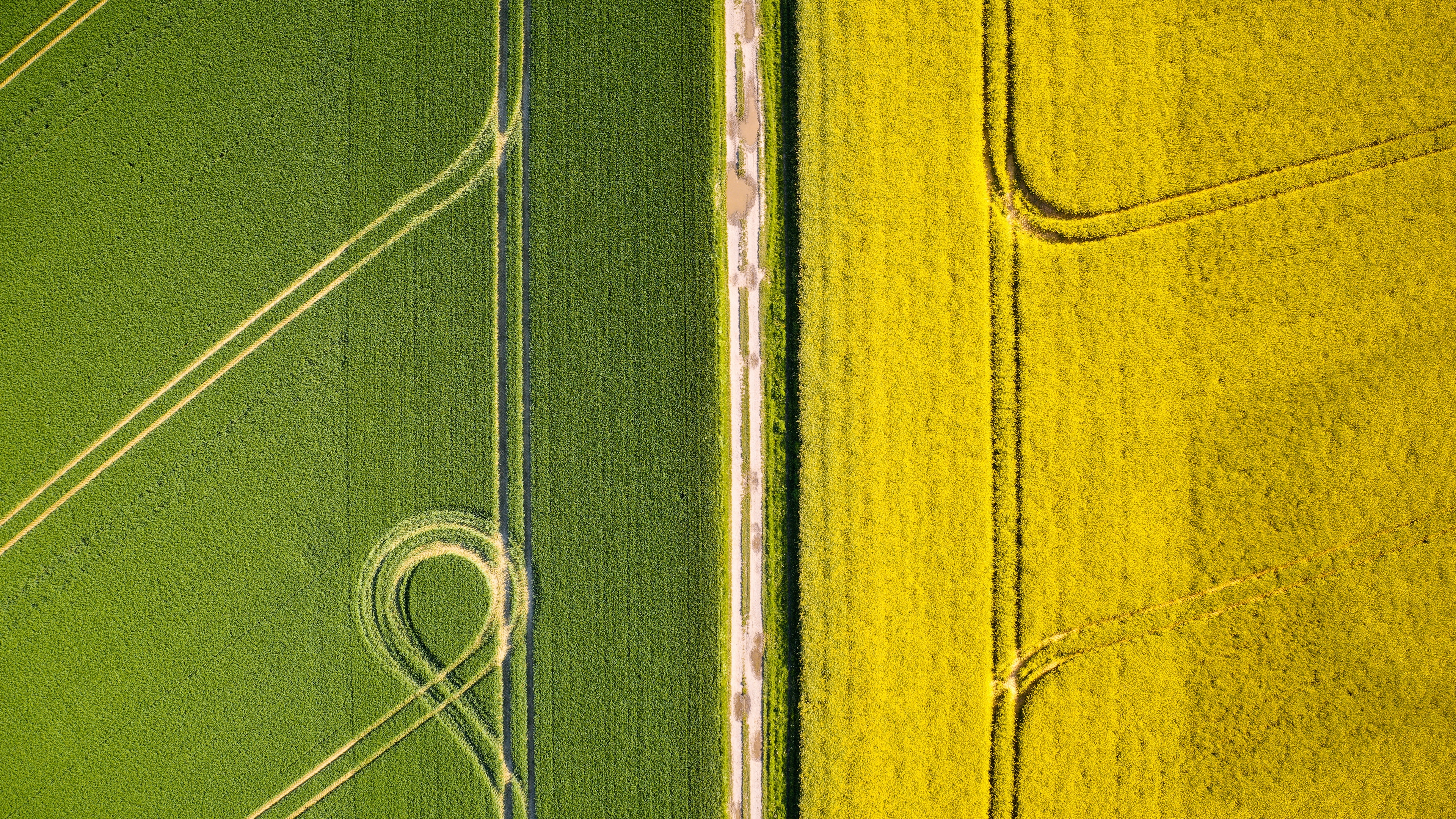Description: A field with a heart shaped in the middle of it and a field with a tractor in the middle.