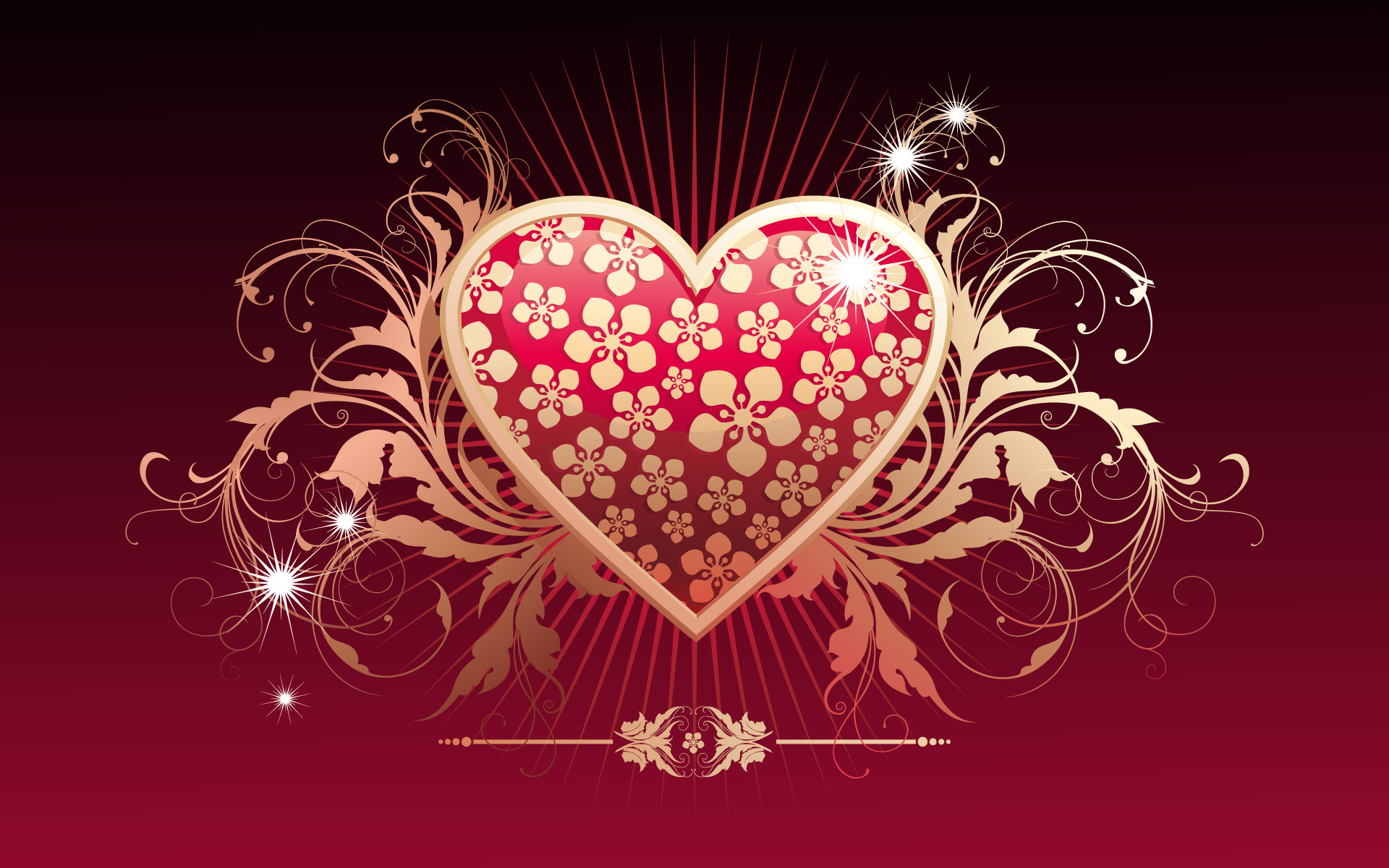 Description: A heart with a floral design on a red background with a gold border and a starburst in the center.