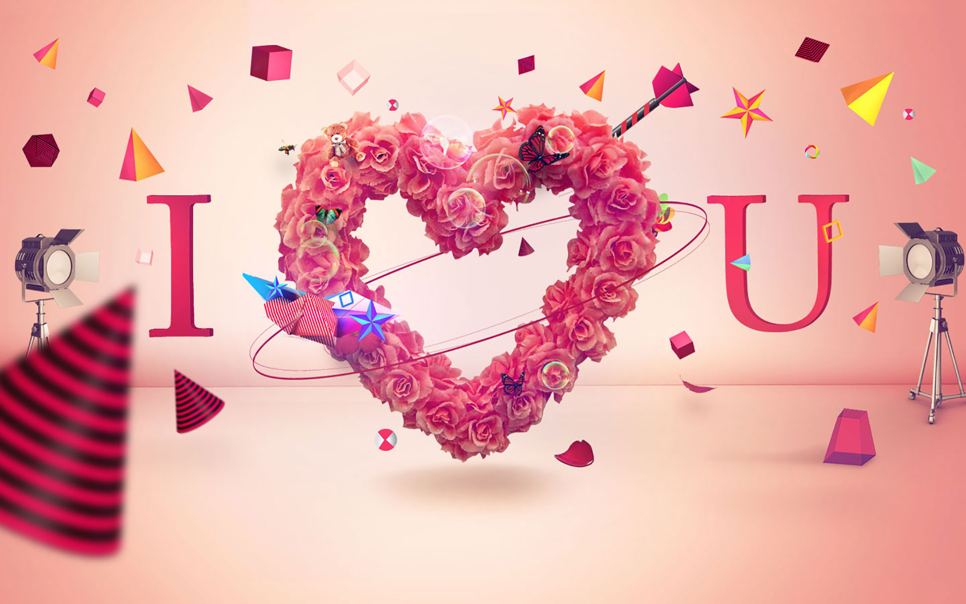 Description: A heart shaped arrangement of flowers and a camera in front of a pink background with a flag and a flag.