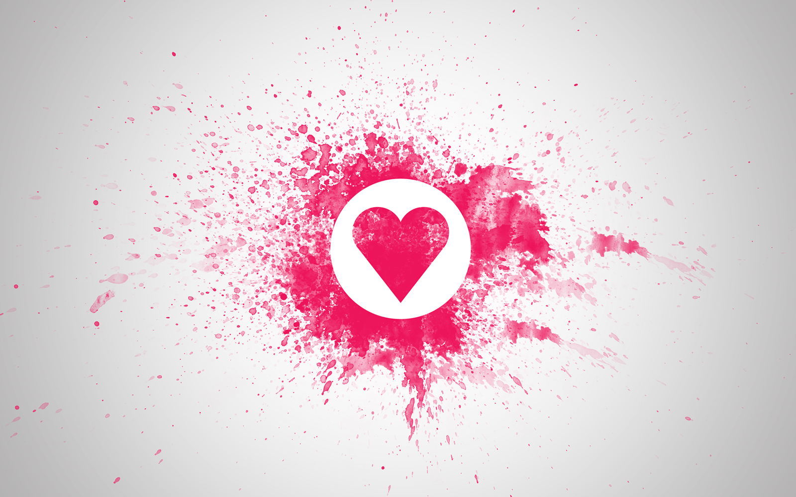 Description: A heart with a pin on it in a circle of paint splatters on a white background with a pink spot.