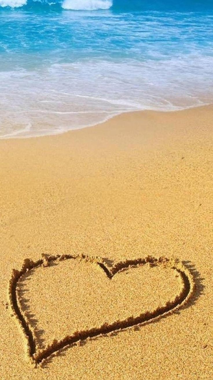 Description: A heart drawn in the sand on a beach with waves coming in and a wave coming in the water.