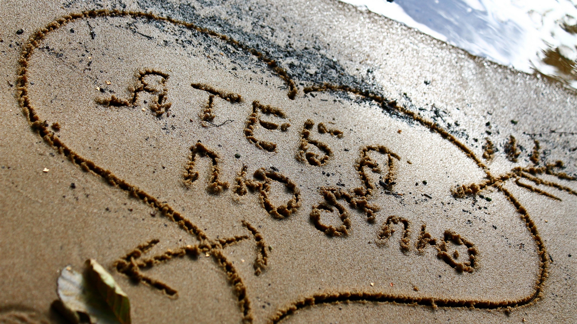 Description: A picture of a heart drawn in the sand on a beach with the words sister and son written in the sand.