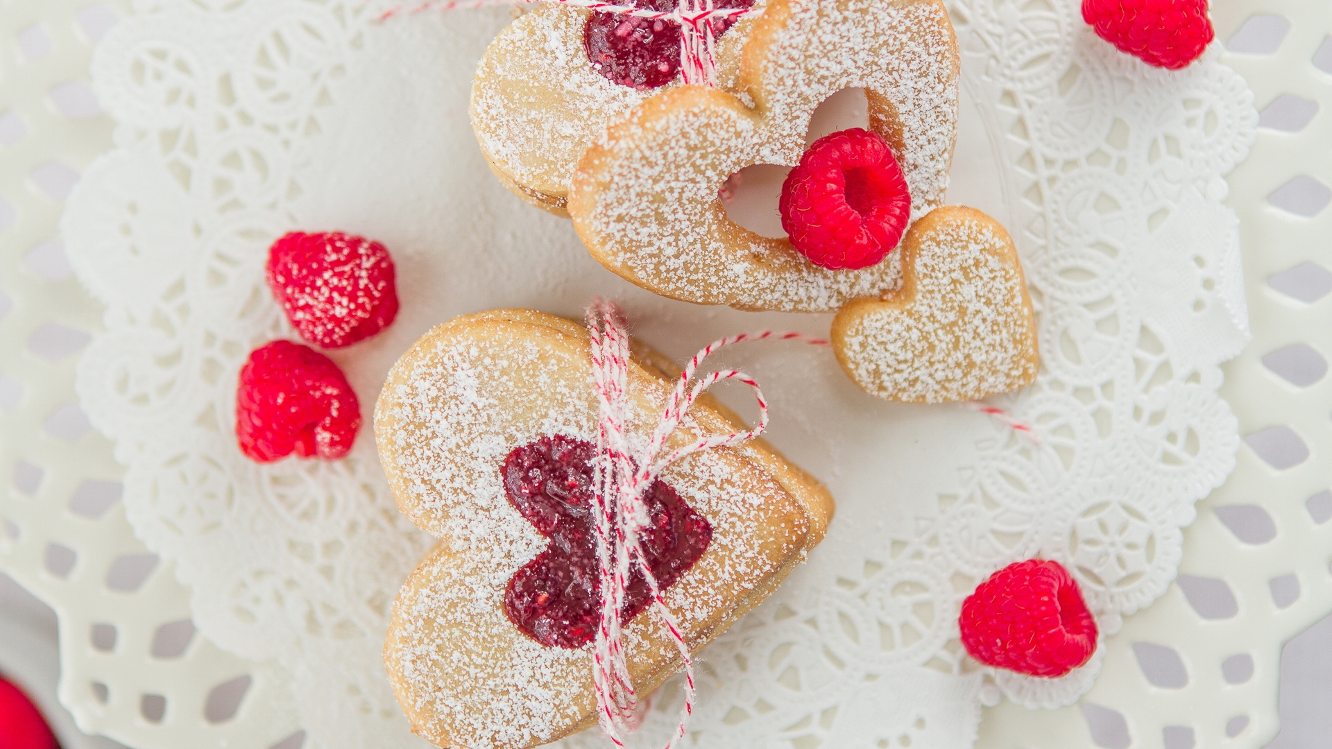 Description: A plate with heart shaped cookies and raspberries on it and a lace doily with a heart.
